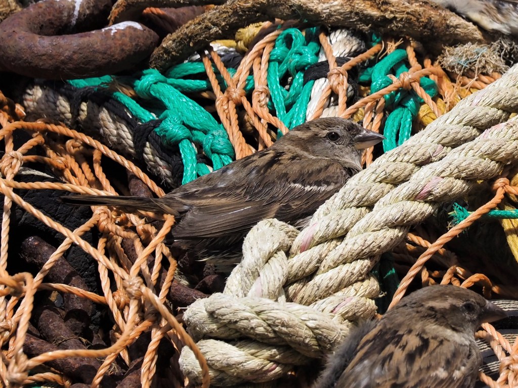 On The Cobb, there were large piles of fishing nets and among them, were several sparrows who appeared to be using the nets to preen. They looked as though they were enjoying it, too.