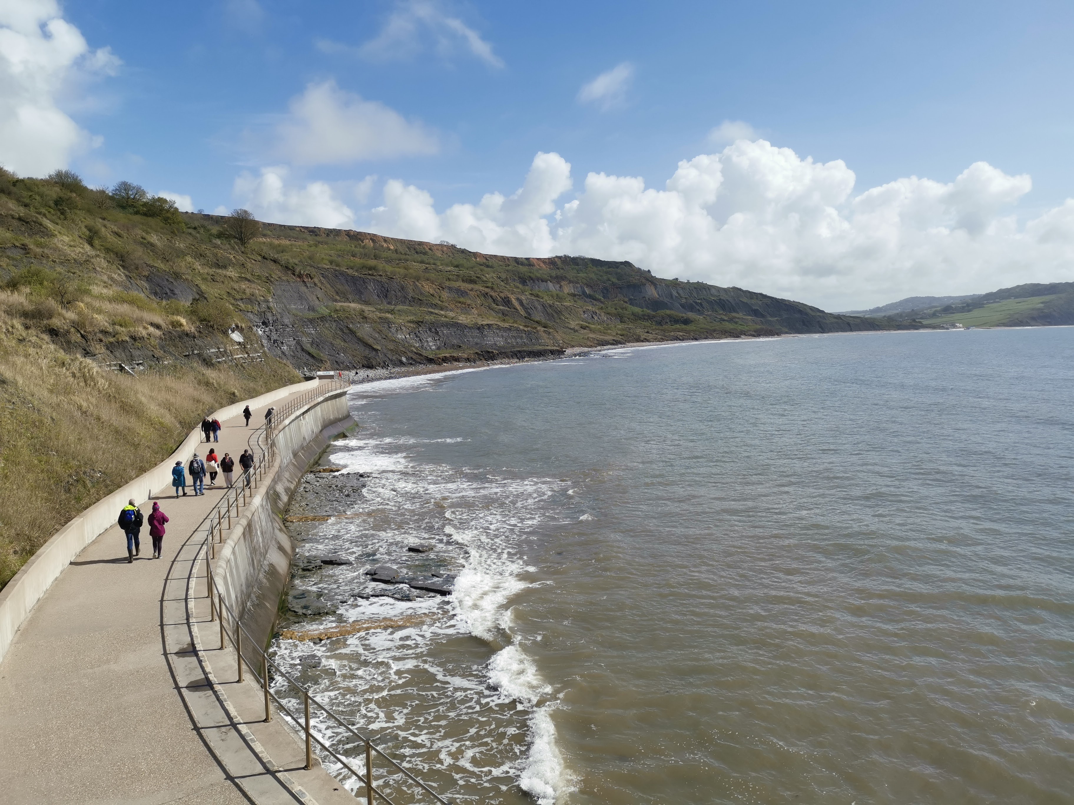 Walking west, towards the town, the sea defences continue and around the headland, a bay is revealed with a prom, at the end of which is a harbour