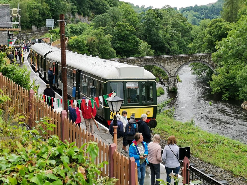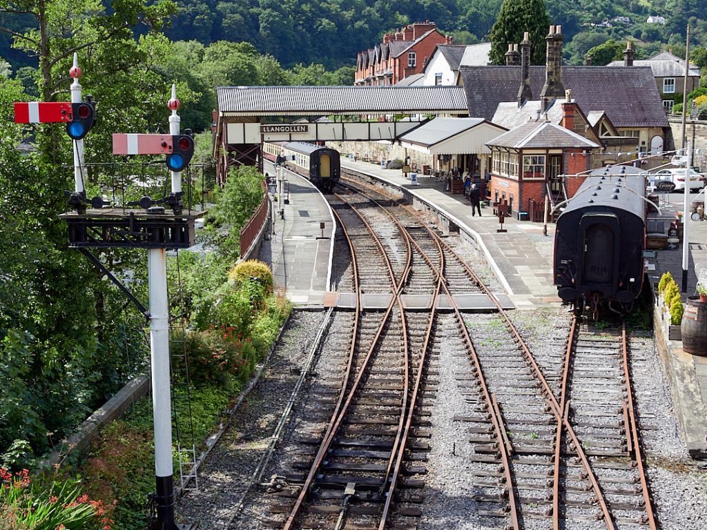Llangollen is a small but busy town which spans the river Dee with a bridge at its heart. A steam heritage railway line, operated by the Llangollen Railway Trust, runs from the town station. The station is right alongside the river with an overhead footbridge from one platform to the other, overhanging the river itself.
