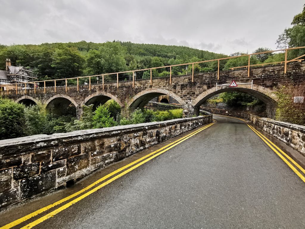 Here, the road and railway bridges cross the river Dee adjacent to Berwyn Railway Station and just a little further along there is an old chain suspension footbridge which crosses from the railway station into the hotel grounds. The bridge is the oldest in the world with this construction and was built well before the road bridge. It was reopened after being renovated in 2015.
