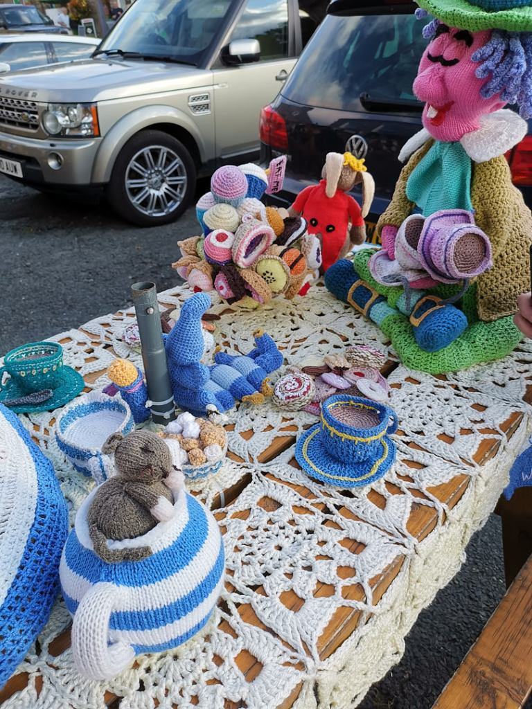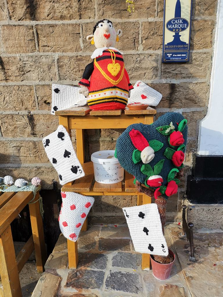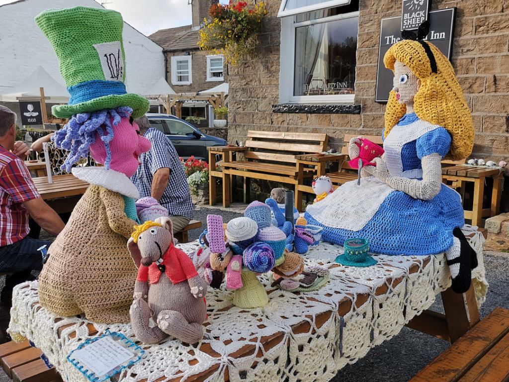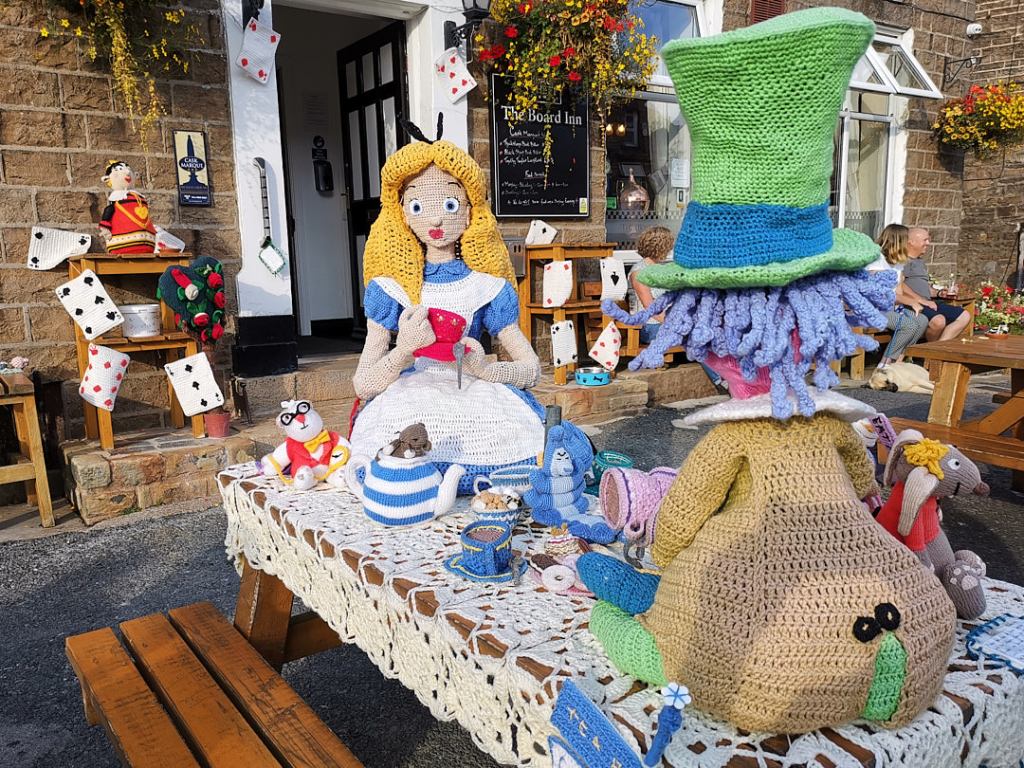The village has decorated much of the main street with knitted “sculptures”. The first we noticed were outside The Board Inn, where one of the tables outside was occupied by Alice in Wonderland and the Mad Hatter, having a tea party.