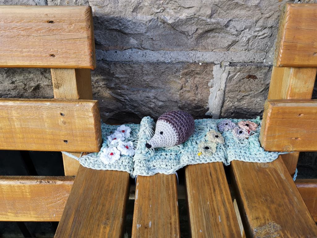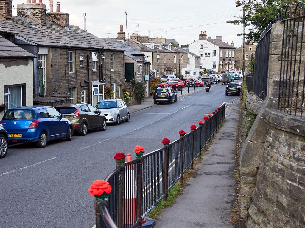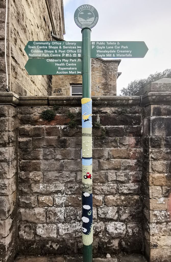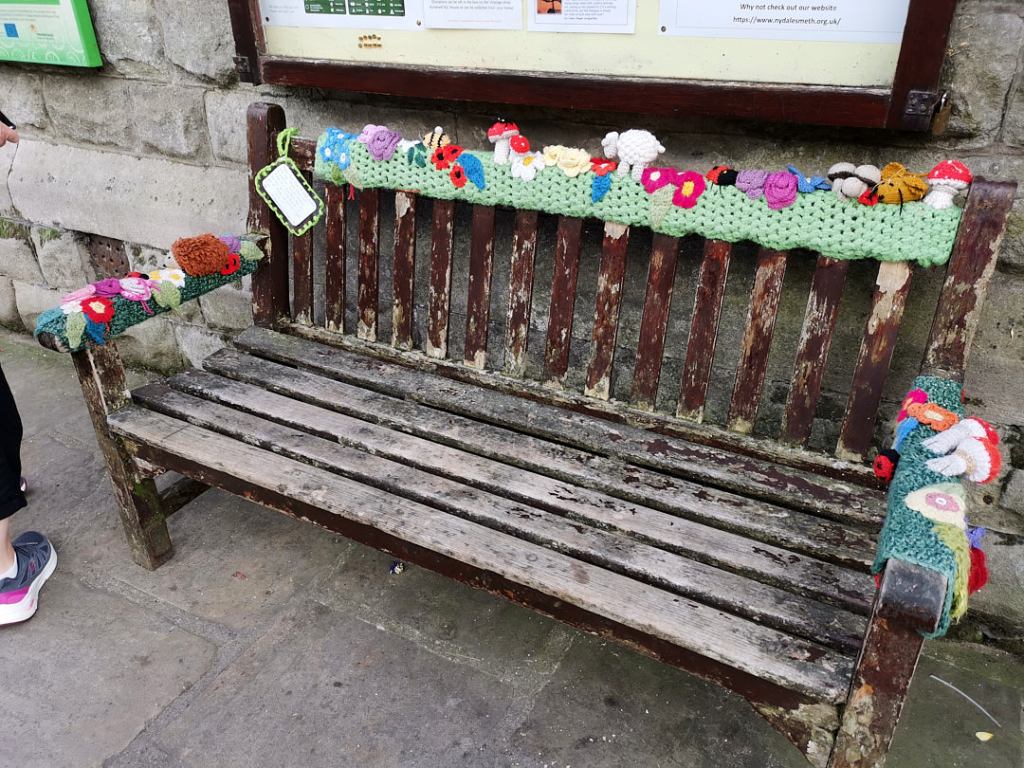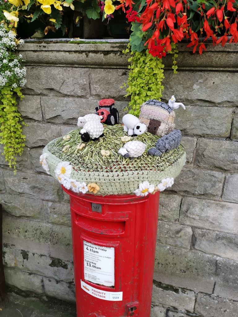 The village has decorated much of the main street with knitted “sculptures”. The first we noticed were outside The Board Inn, where one of the tables outside was occupied by Alice in Wonderland and the Mad Hatter, having a tea party.