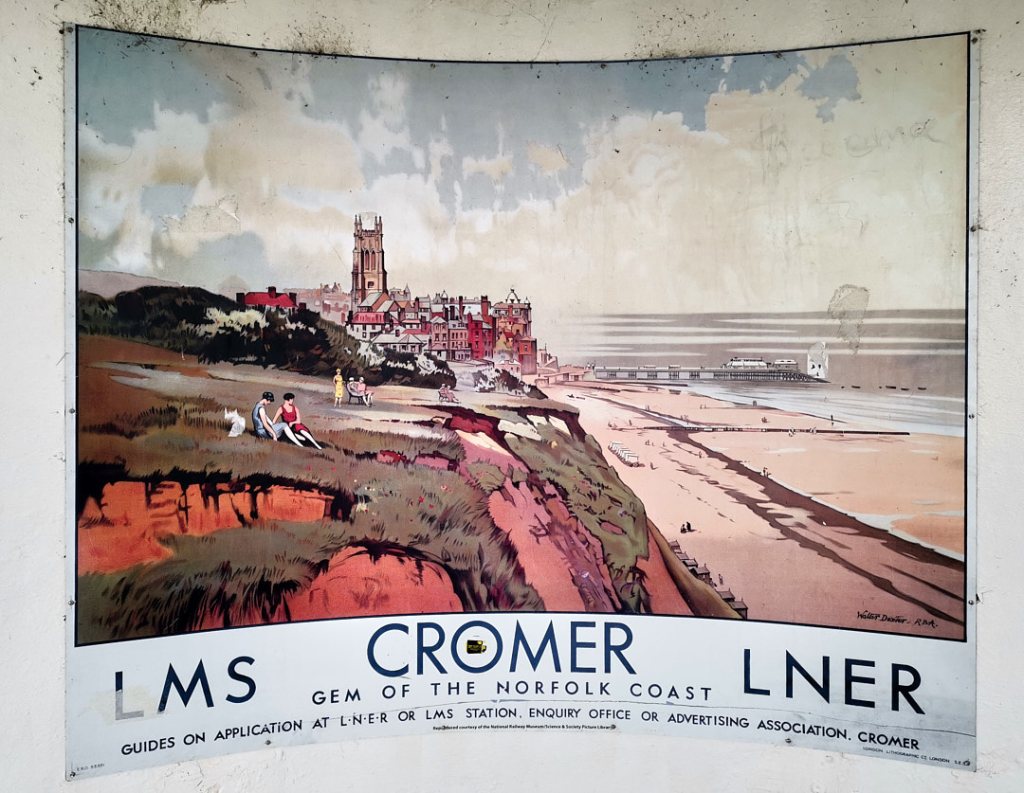 One of the shelters, part-way down to the beach from the cliff-top, has a reproduction LMS/LNER poster advertising the town as “The Gem of the Norfolk Coast”:
