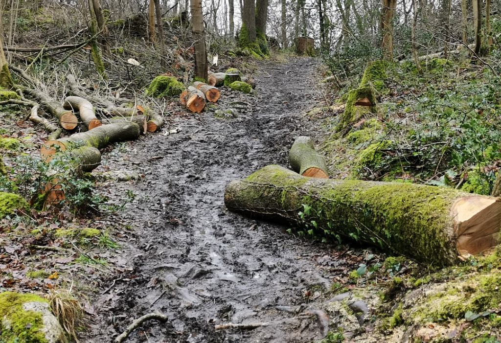 In places steep and very slippery, the path took us around the back of the crag and onto the summit. There was also much evidence of tree felling, possibly as a result of recent storms.