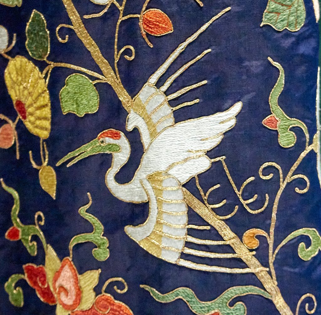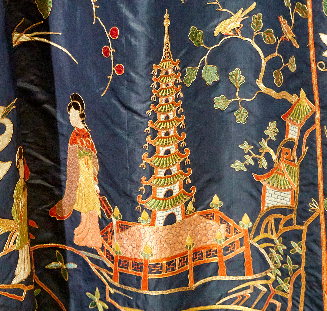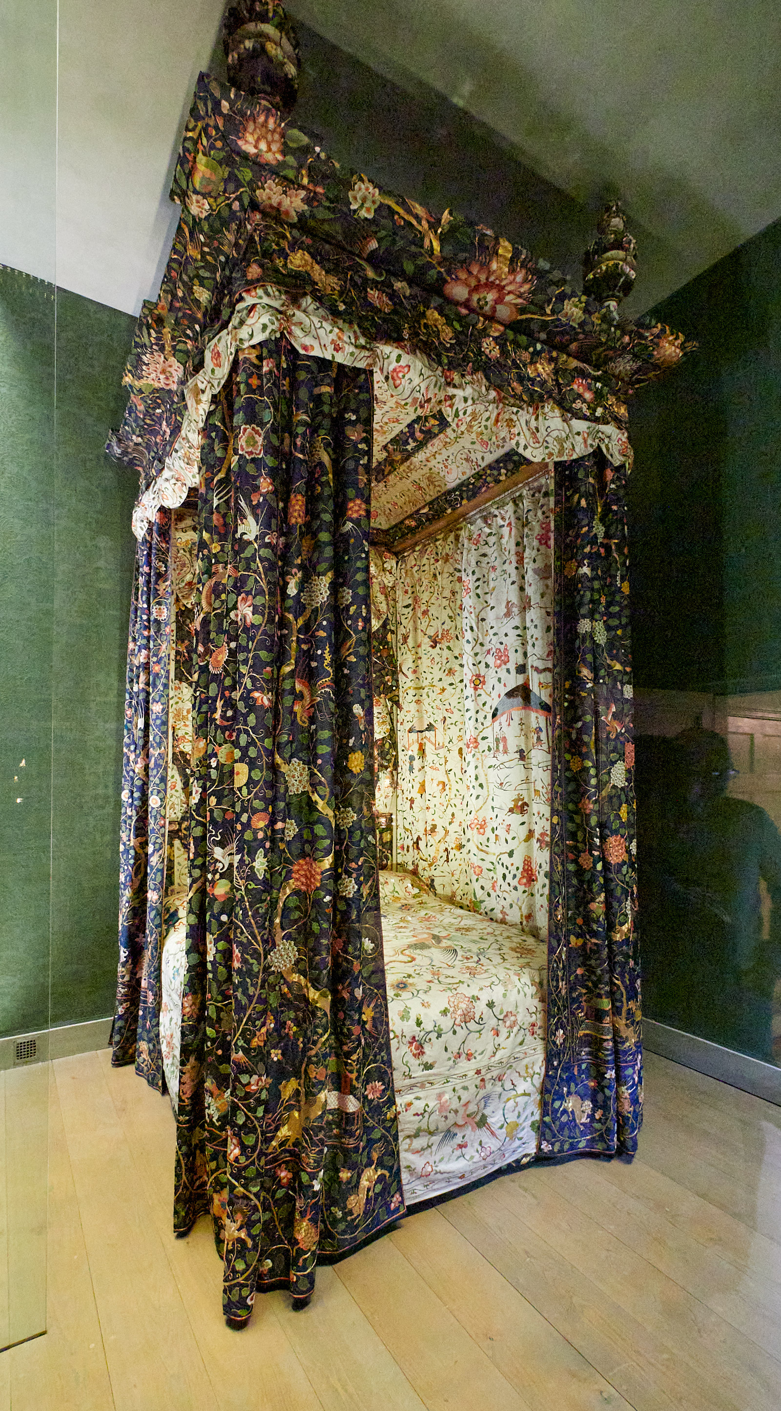 This extremely tall four poster, behind a glass-walled partition, has remarkable hand decorated Chinese silk curtains: