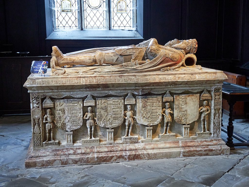 At the head of the right hand aisles, is an area alongside the choir, which has an impressive alabaster table tomb with the effigies of Francis, the 2nd Earl of Huntingdon and his wife, Catherine Pole. On the side shown in the image below, there are figures of their 5 sons and on the other side are figures of their 5 daughters.