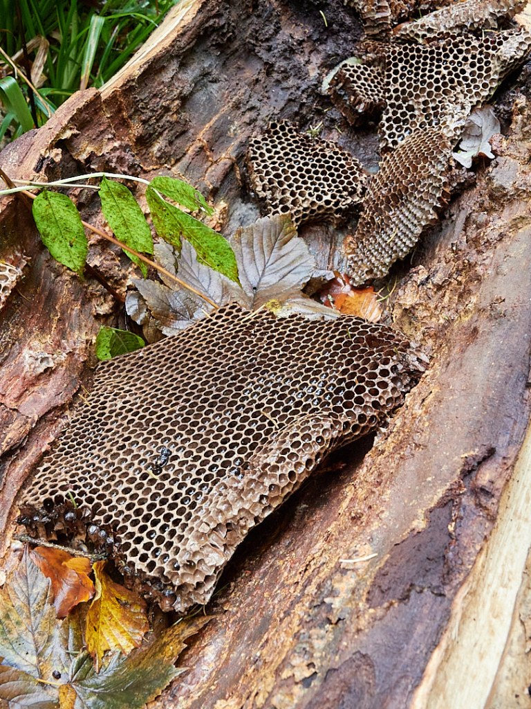 Many trees had been recently felled, some being left across the brook and alongside the path. Interestingly, one of the felled trees had contained a beehive within its hollow trunk.