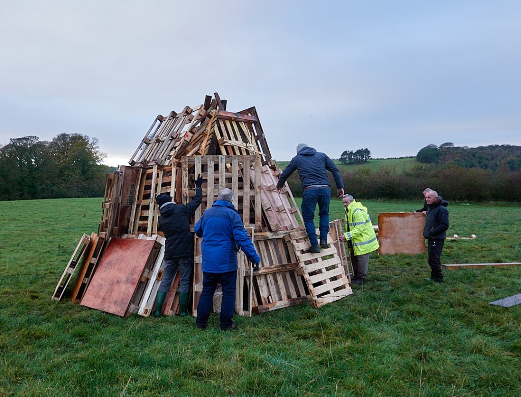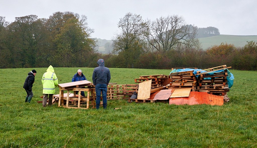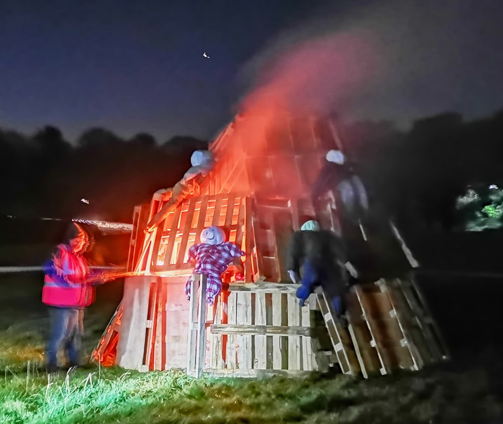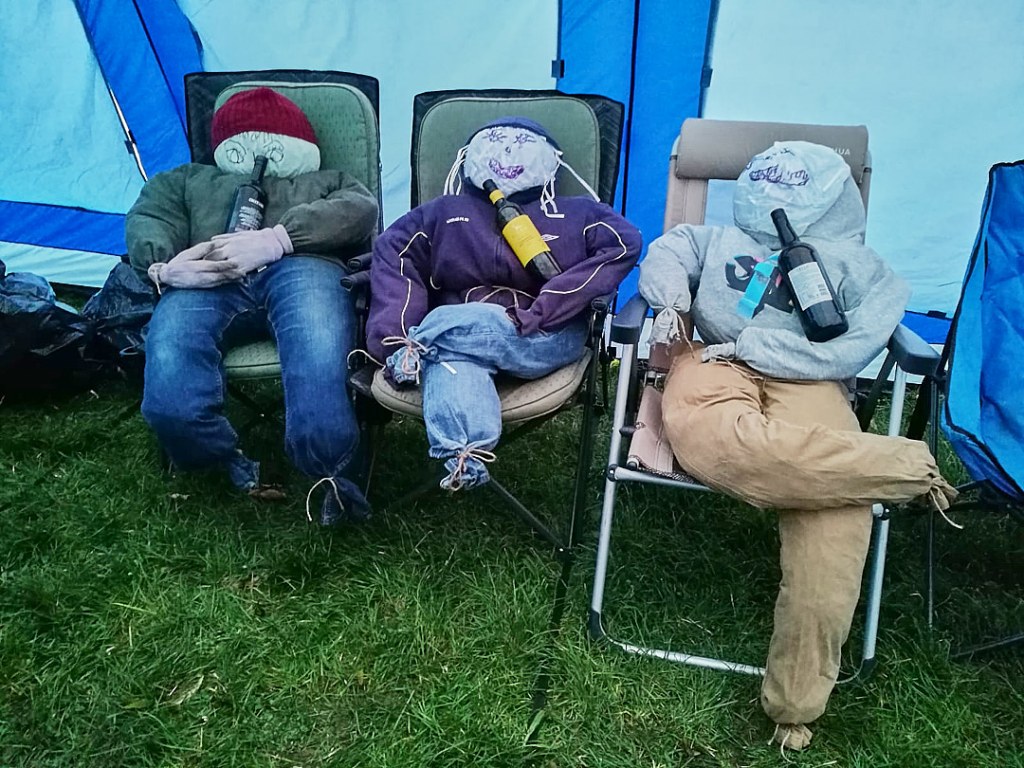On Saturday morning the weather was dreadful, with wind and driving rain which ensured that we did not go for a walk as planned. Mid afternoon saw us helping to build the bonfire (still in heavy rain) and making “Guys” in the party tent, for the bonfire. Traditionally just one Guy Fawkes is ceremonially burned, but three were made by the enthusiastic women in the tent and a further one mysteriously appeared on the fire later.