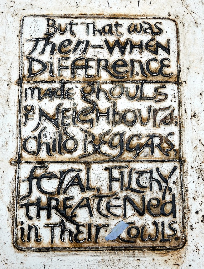 There are 10 of these cast iron tercet waymarkers covering the route from Barrowford, through to Lancaster. One for each of the ten people hanged, each bearing a tercet stanza from the walk’s poem by the Poet Laureate, Carol Ann Duffy. According to Wikipedia, a “Tercet” is a poem of 3 lines which form the complete poem or a stanza.