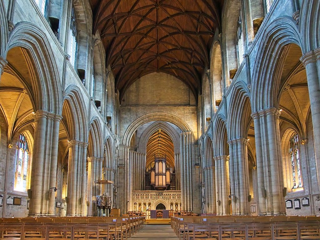 Along the aisle walls, the seating is covered with tapestries. These “Millennium” cushions tell the story of the city of Ripon in 5 million stitches, from the 7th century to the year 2000. The first church on the site was built by Saint Wilfred.