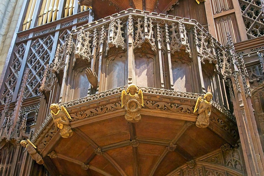 These days, the choir singers are conducted from the floor of the choir, but in days gone by, the organist would pass instruction via the remote-controlled wooden hand just behind where they sit, which could be made to wave.