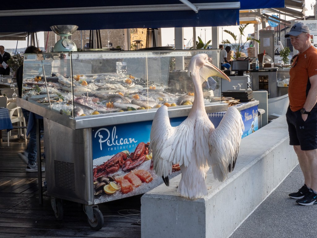 Afterwards, we ate in a harbour-front restaurant which was excellent. A neighbouring restaurant has a pet pelican, which seemed very interested in the contents of the seafood display cabinet.