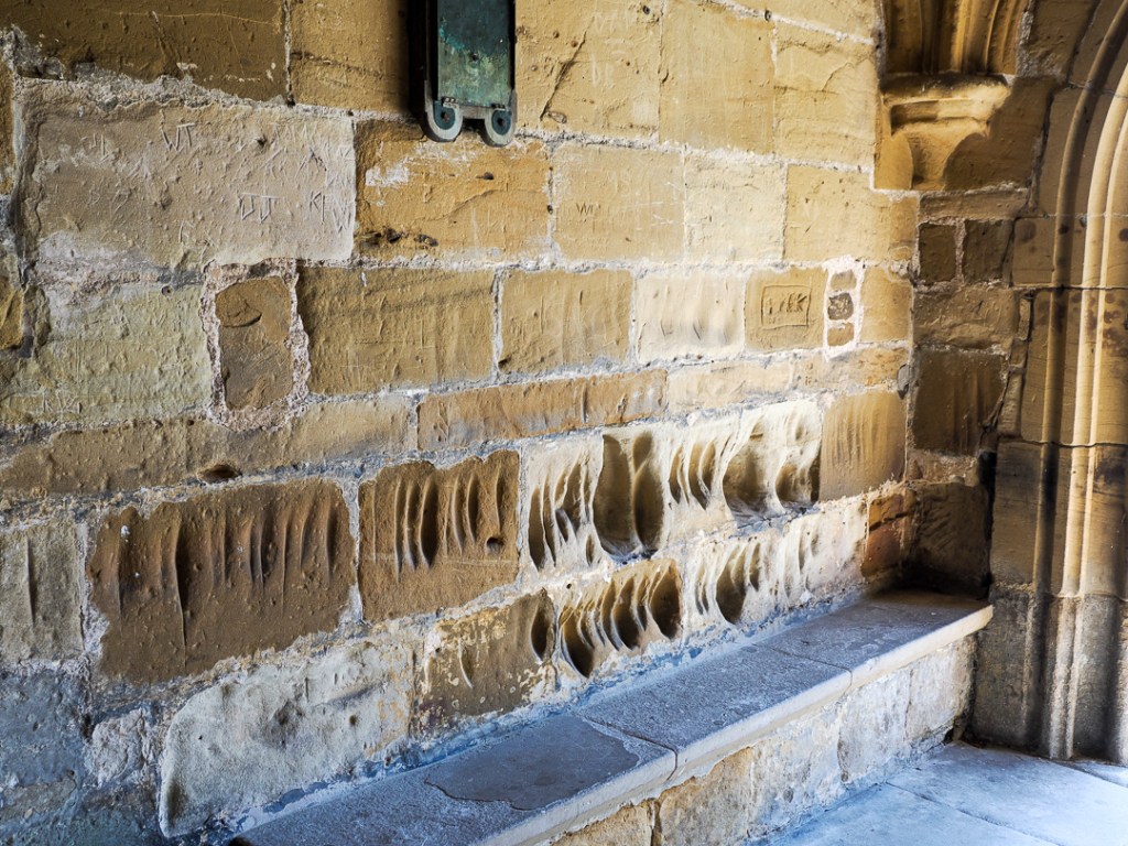 Below, you can see in the porch roof, swallows had built their nests. The grooves on the walls are where those attending archery practice had sharpened their arrows. Archery practice was a mandatory requirement of men in the medieval period.