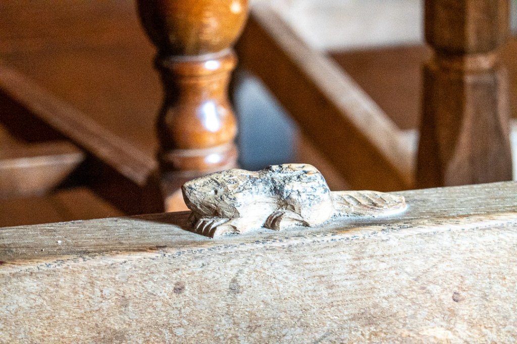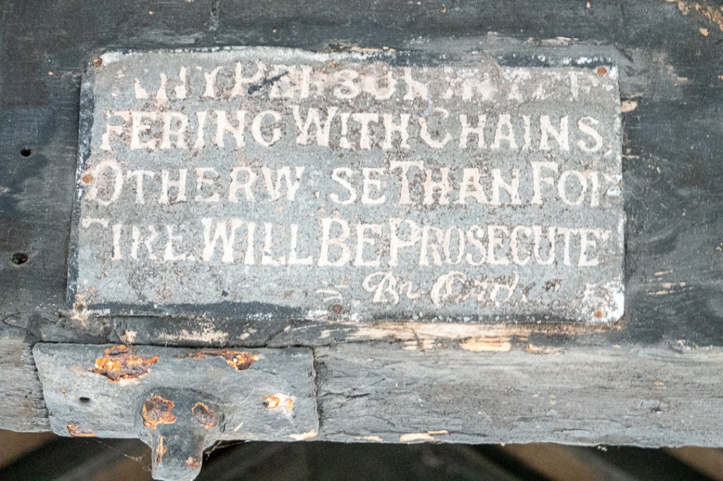 A warning notice on one of the roof beams states “any person interfering with chains, otherwise than for fire with be prosecuted, by order”. I wonder what the chain were there for and how they might be used in a fire.