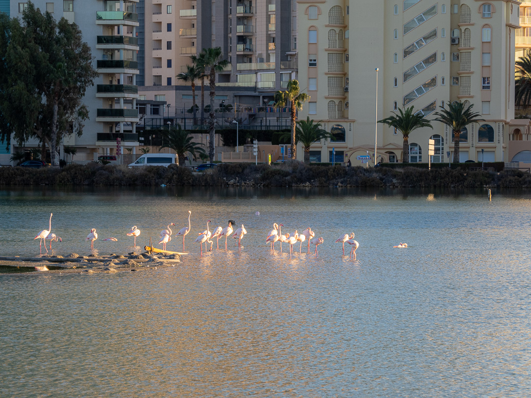 There is a shallow salt-lake, which used to be used for salt extraction. This is now an urban nature reserve, which has a population of wading birds, including grey herons and large flamingos.