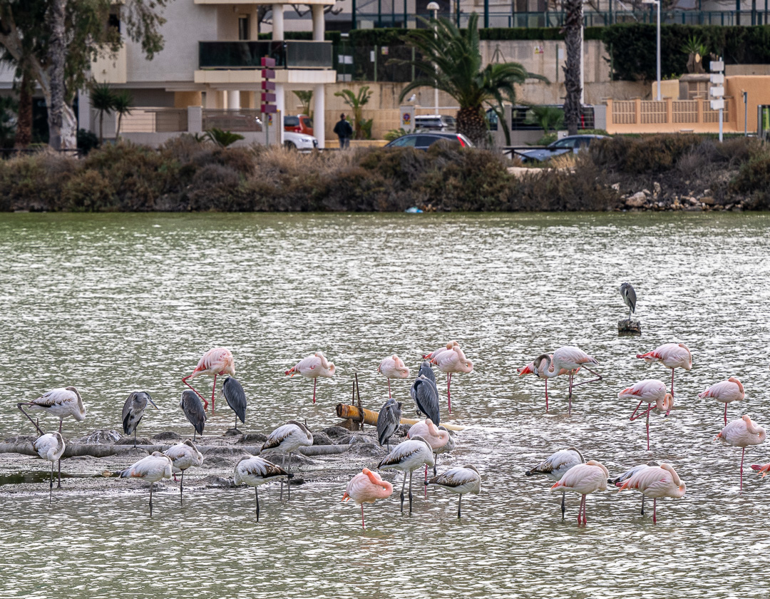These are wild GreaterFlamingos, which have settled there, along with quite a few Grey Herons. The grey flamingos are young birds which have not yet accumulated their colouring.