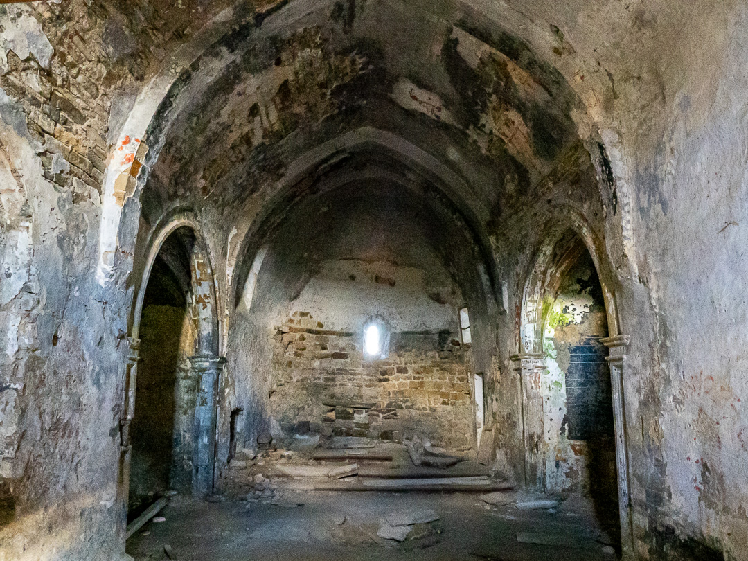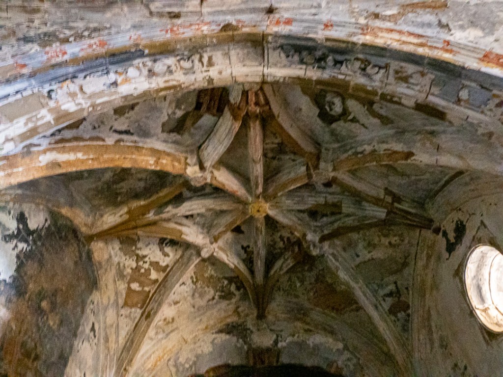We had a brief look inside the church, which was the highest building in the village standing on a platform which is a heavily buttressed terrace on the hillside. The belfry floor looked rotten and full of holes, but the nave and transepts seemed to be weathertight.