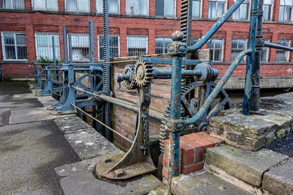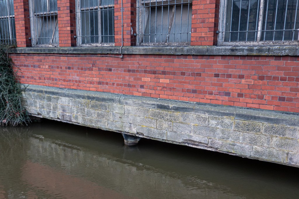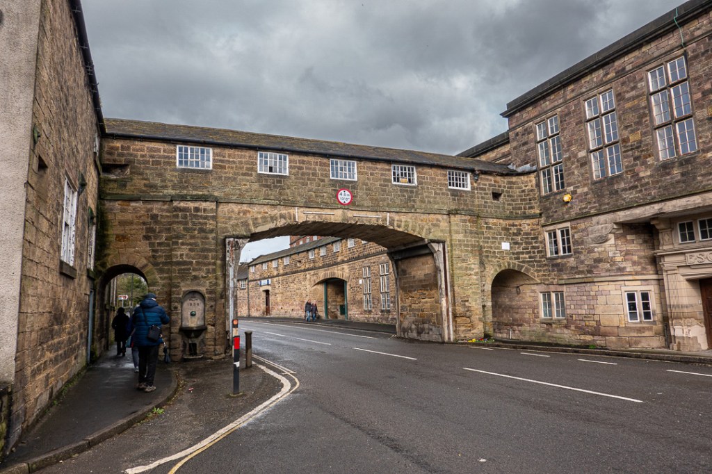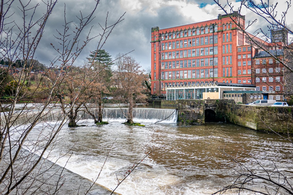 …but the main attraction is the mill complex at the northern end of the town, where the River Derwent has been managed to create water power for the cotton mills. Water levels are maintained via a horseshoe weir and a barrage with many sluice gates. The river is still used to provide power at this point, with electricity generation in the mill buildings.