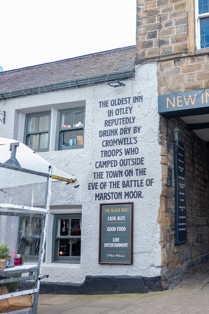 Otley has the, perhaps dubious, distinction of having the highest resident to pub ratio in the land, with 30 pubs; ” a pub on every corner”. There are a few less now, but there are still 20, some of them being old coaching inns. The Black Bull has a claim to fame which is written large on the pub wall: