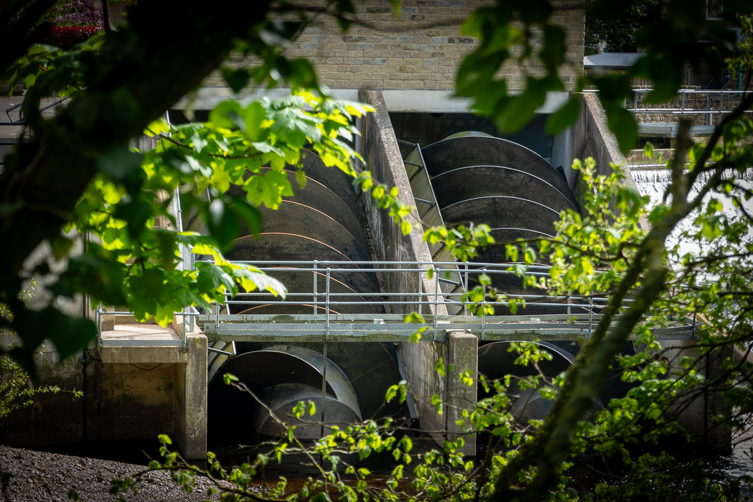 Huge Archimedes screws, used to equalise the water levels above the weir