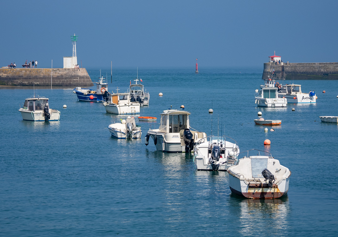 The harbour is busy and there are some fishing boats moored on the quayside: