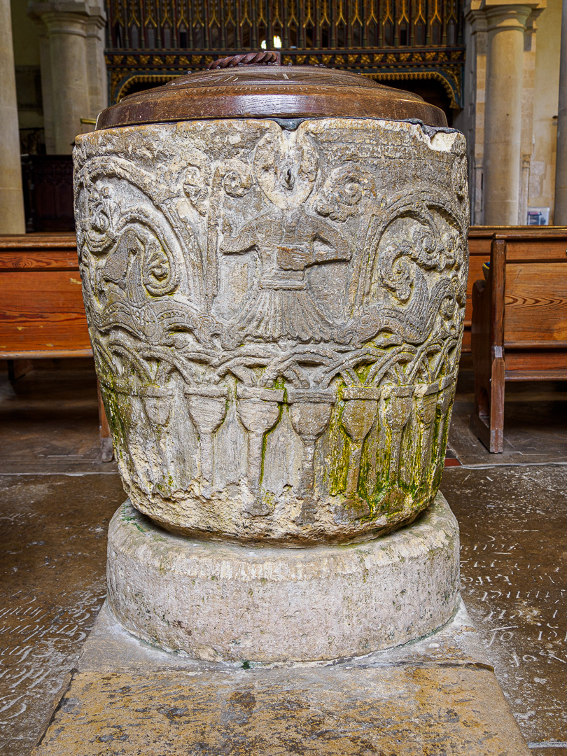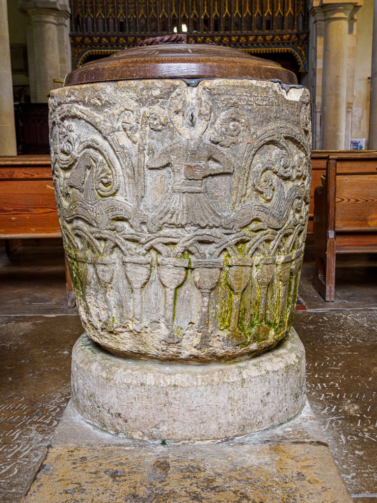The Saxon baptismal font depicts St Michael holding a crozier and two serpents with twisted tails.