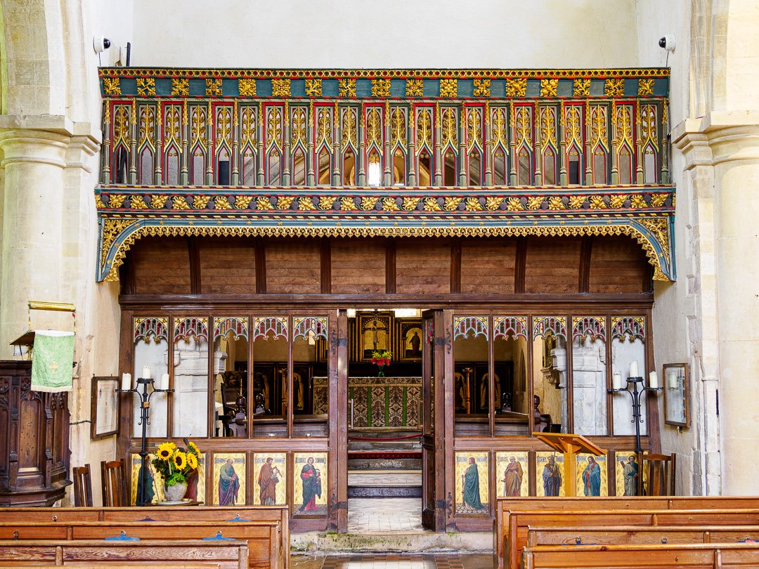 The Victorian rood screen has a rood loft above which was built in the 15th century and removed in the reign of Elizabeth I and hidden behind a wall. Rediscovered in 1812, it has been repainted.