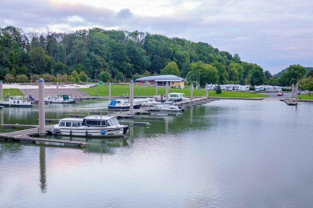 Charleville-Mézières was a bit of a surprise. We had a lot of “fun” trying to get to the motorhome aire, even inadvertently calling by one of its suburbs, “Manchester” (it seemed a long way to drive to only get there!). When we arrived, we found a good spot on the aire, overlooking the marina.