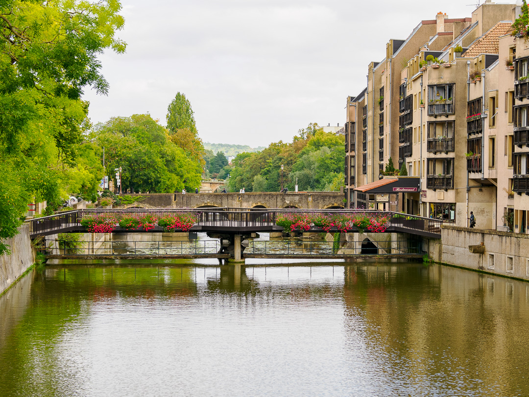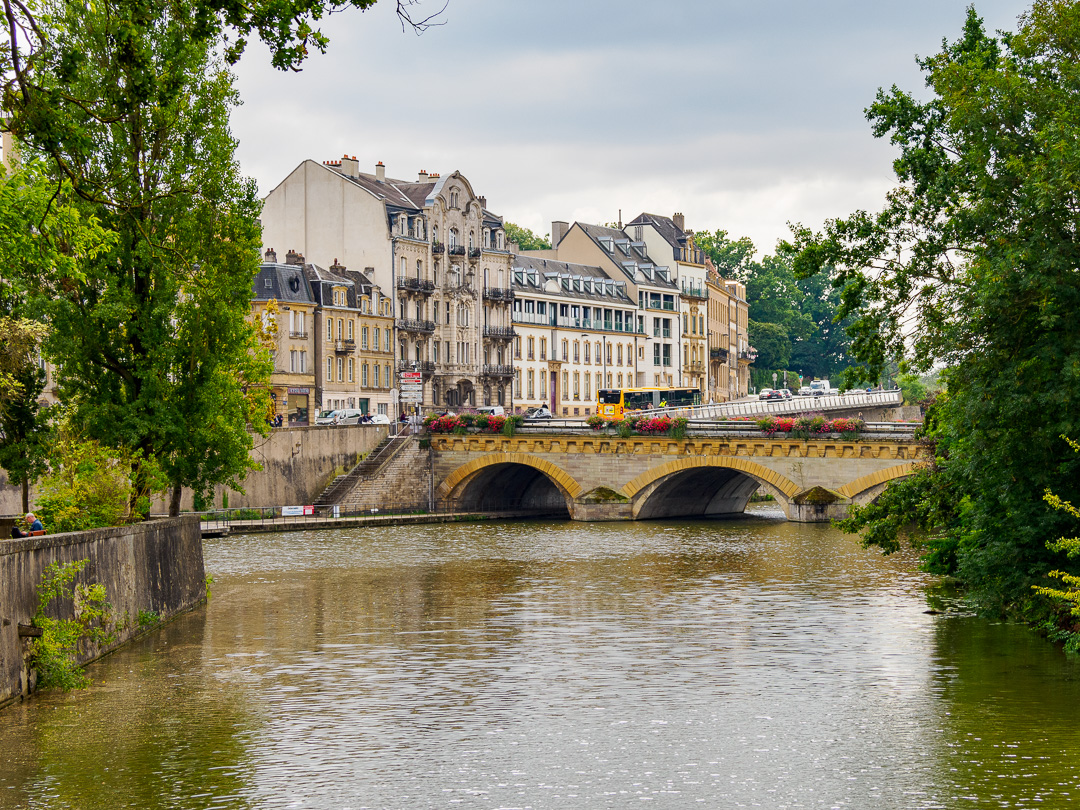 Metz is a city built on the Moselle and Seille Rivers. We stayed the night right next to the River Moselle on the motorhome aire which is only a short walk from the centre.