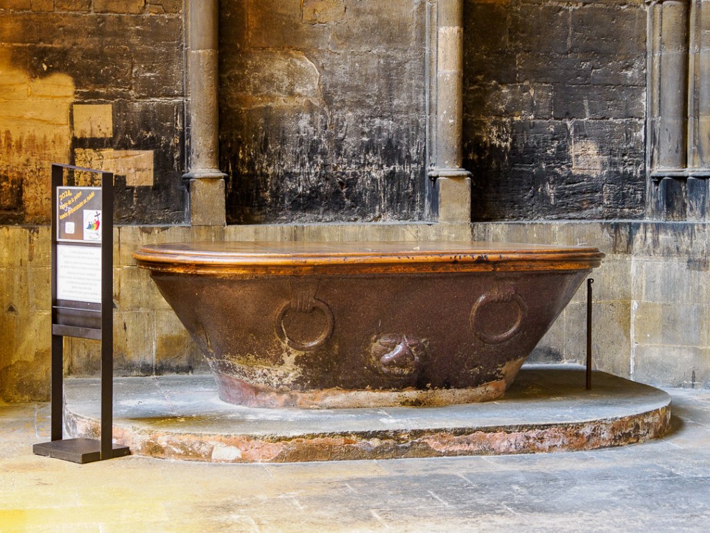 There are many fine animal-shaped gargoyles on the cathedral. The baptismal font (below right) is a genuine Roman bathtub in Egyptian porphyry dating back to the 2nd or 3rd century.