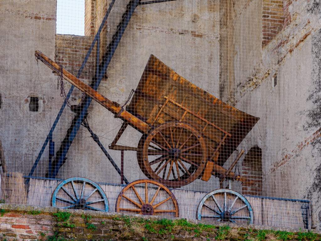 One of the town gates was decorated appropriately, with a cart above in the tower, a grape press and many bunches of grapes hanging from the roof in the entrance: