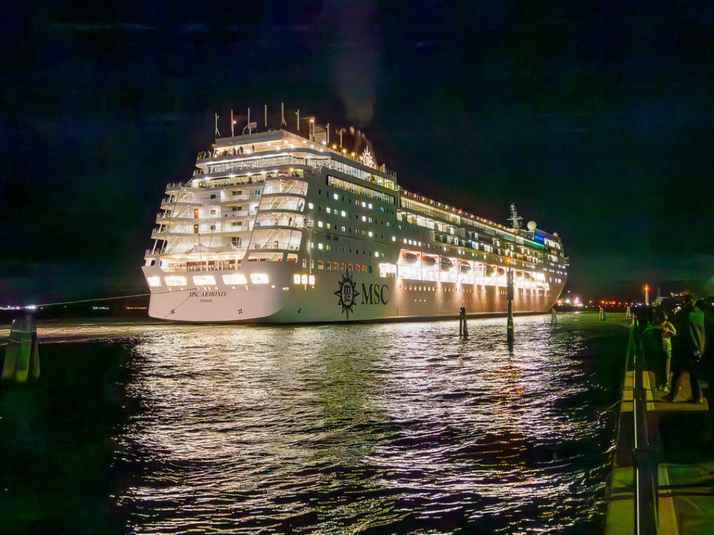 Our pitch is near the main channel for large ships visiting the port of Venice, and it is amazing to see massive vessels pass by only a few yards away.