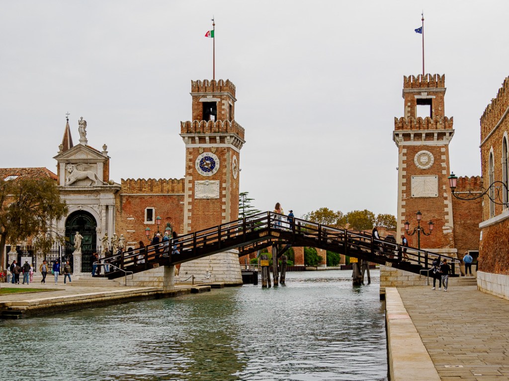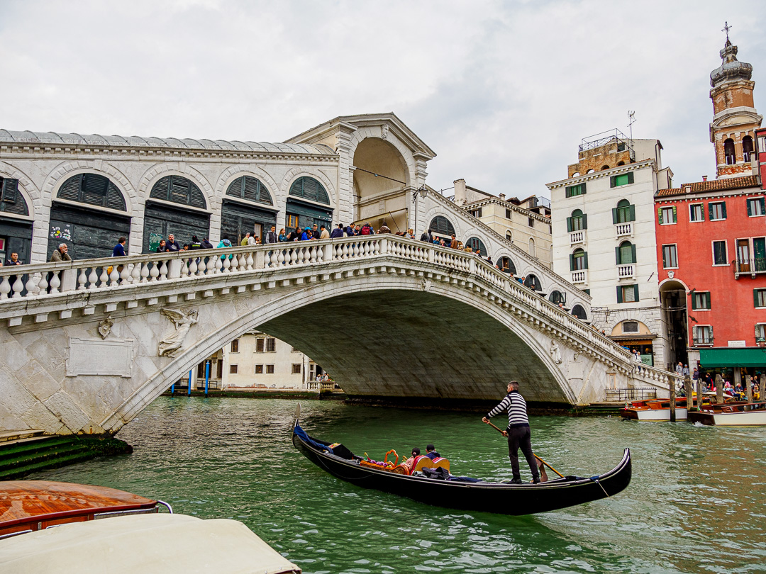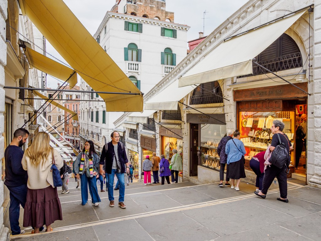 The Rialto Bridge over the Grand Canal, is actually a “shopping arcade” with a walkway either side: