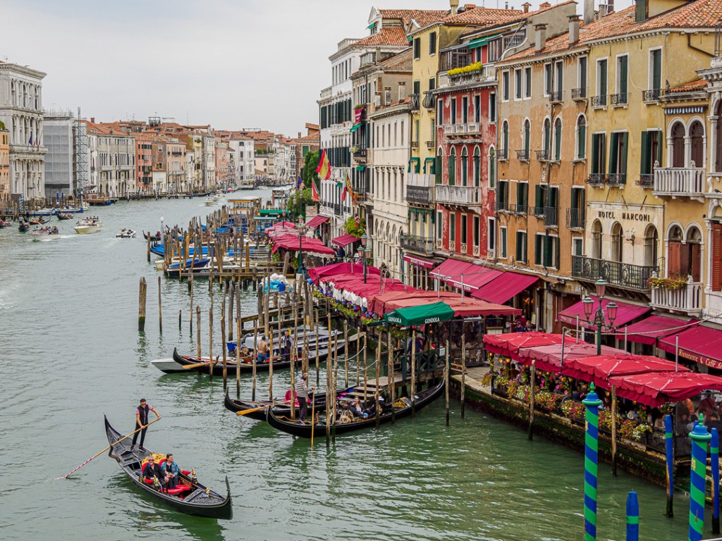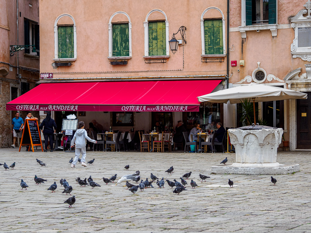 It is fair to say that Venice is an extraordinary experience. There are loads of people, but no traffic to worry about, all motorised traffic being on the canals. There are not even any cycles or motorised step-on scooters. There is also plenty of space, with many large open squares scattered about.