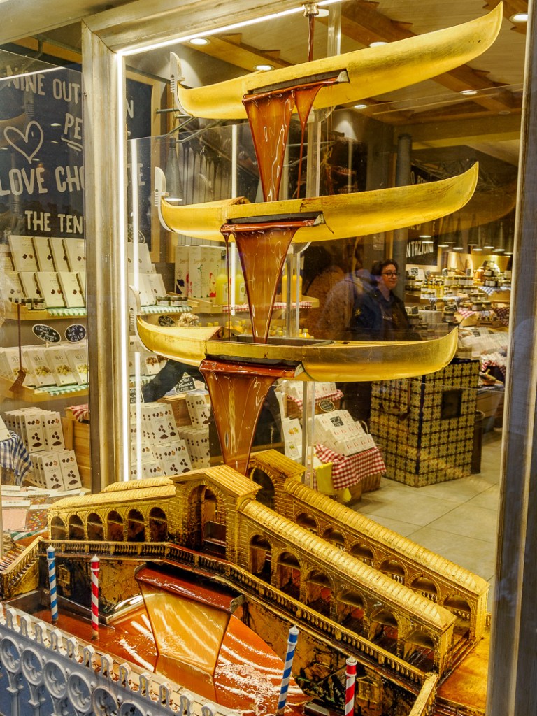 The chocolate shop was especially interesting, with its unique chocolate fountains in the window: