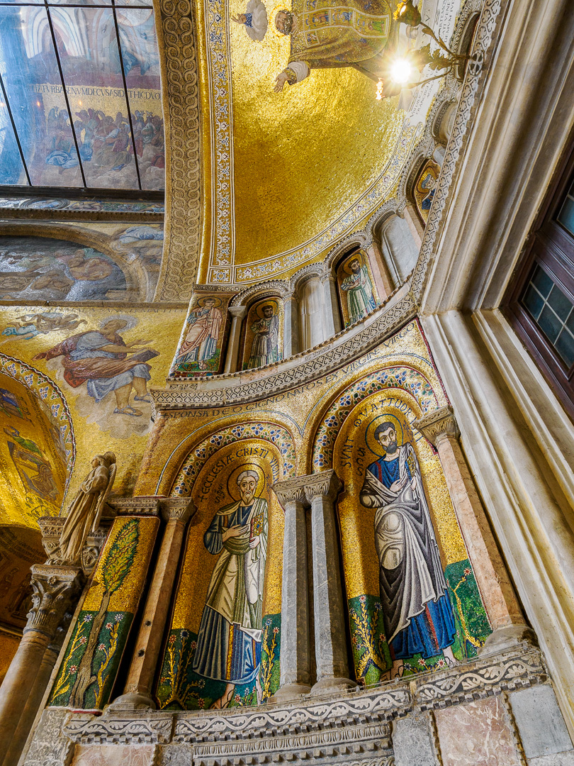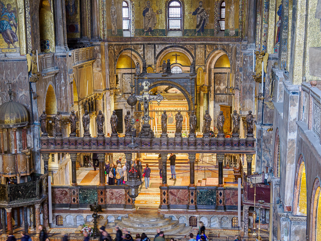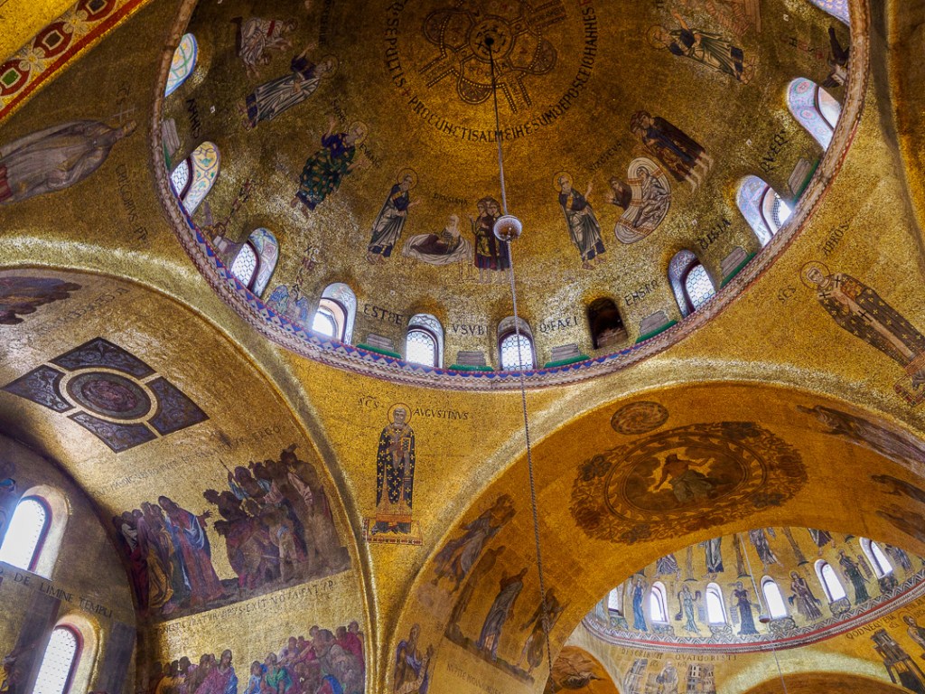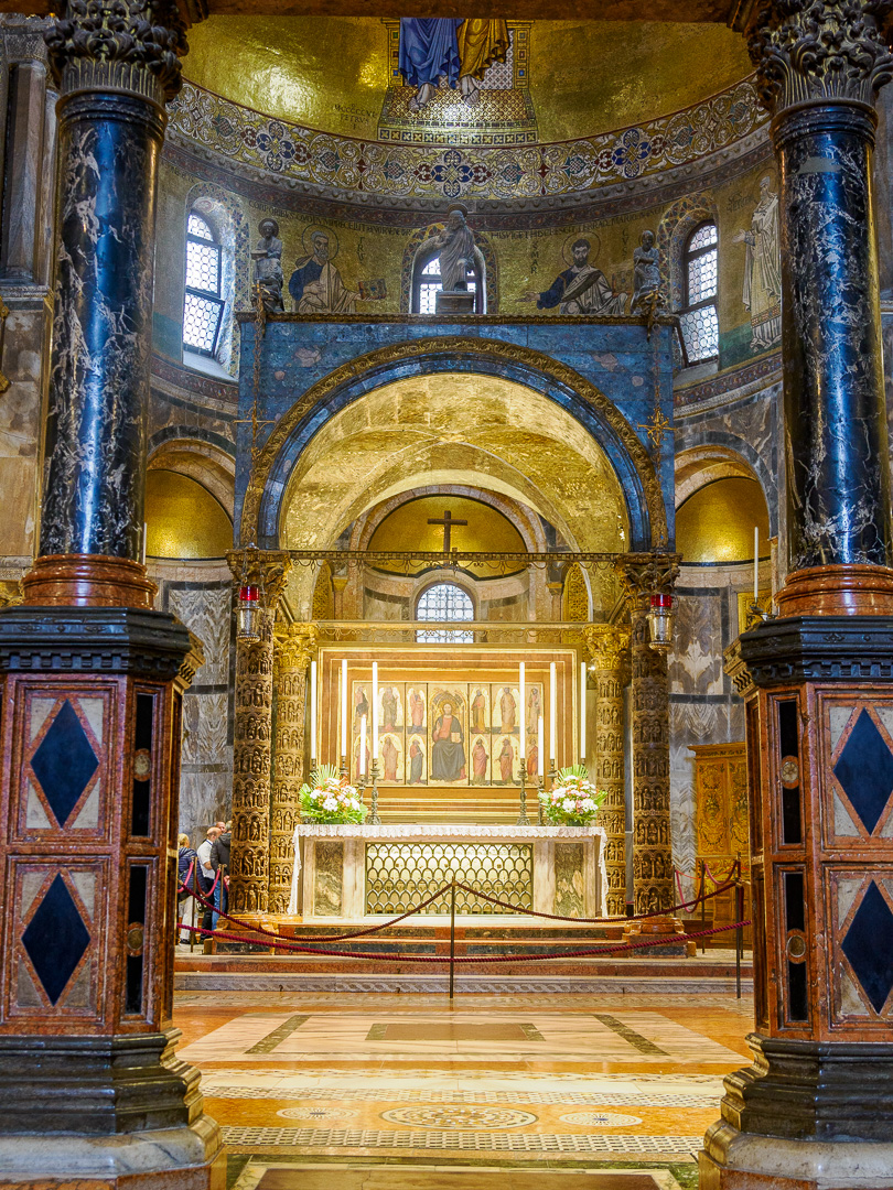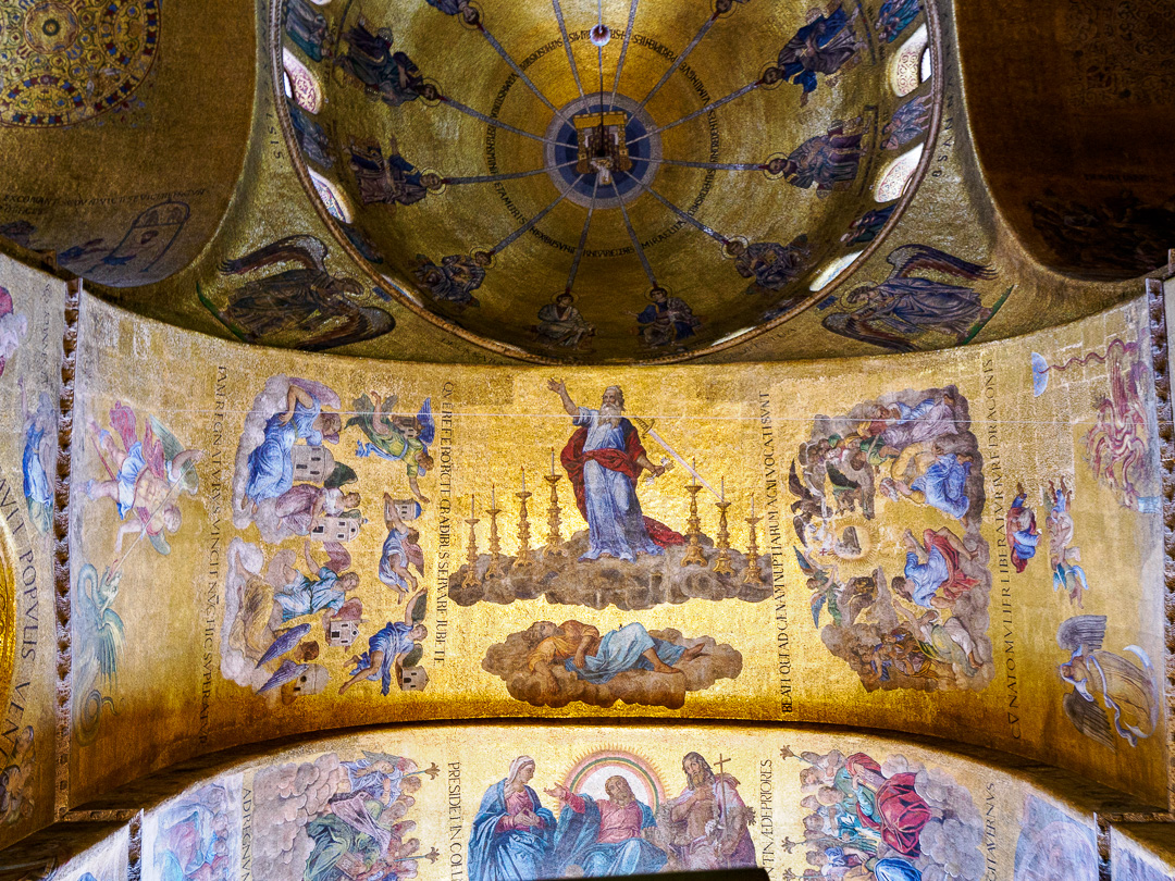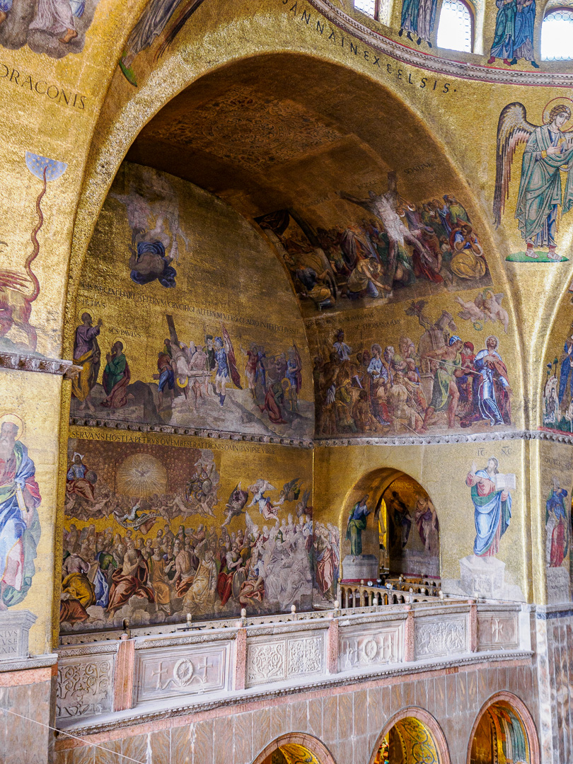 Towards the end of the day, we noticed that the usually long queues for entry into St Marks, had disappeared, so we went in. This is another astonishing building, which is quite dark inside, but when you get used to it, you realise that every part of every wall and ceiling is covered by mosaic and all the floors are laid with geometric pattern of coloured marble.