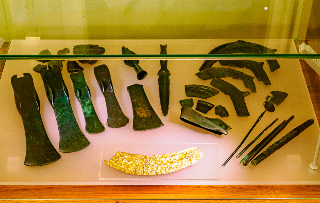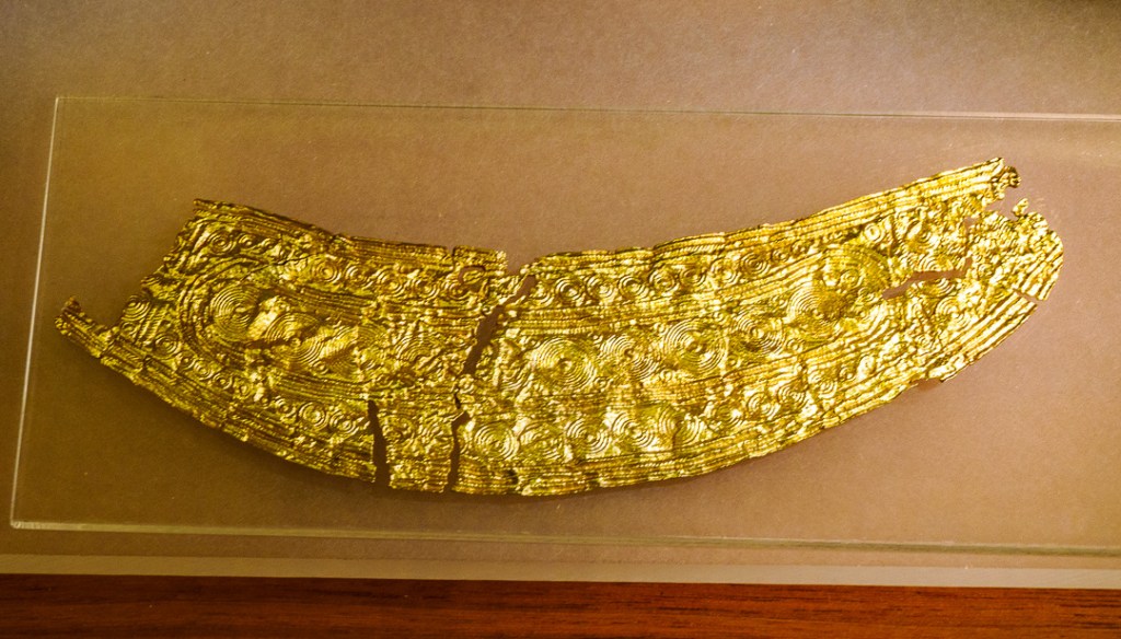 The museum with some finds from the bronze age including bronze axes and this highly worked gold object: