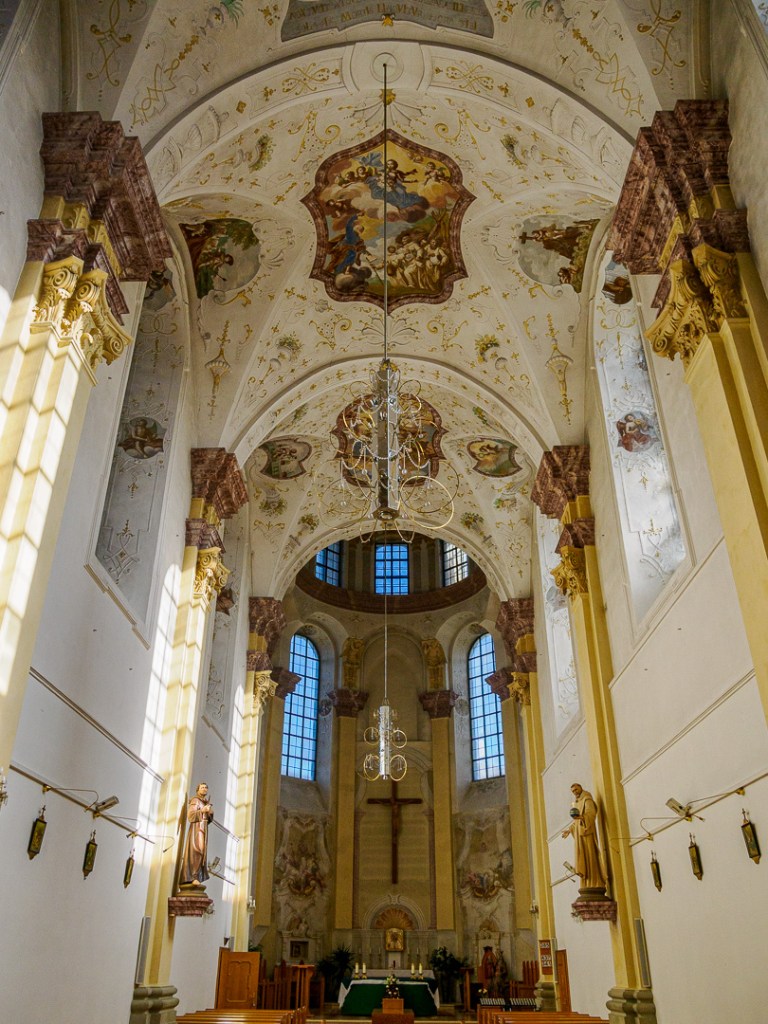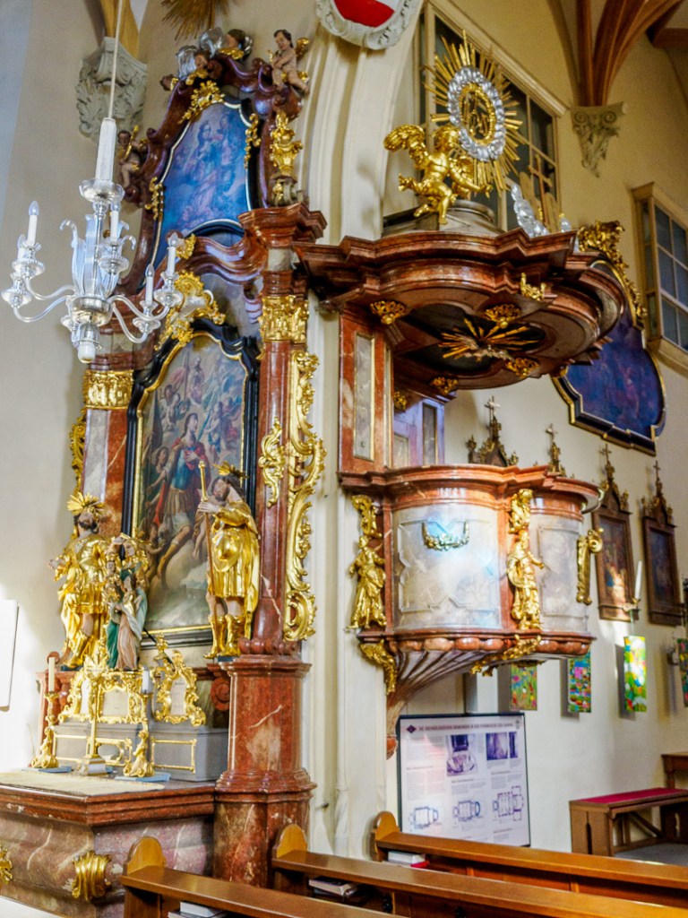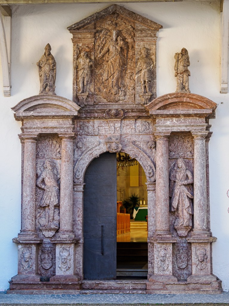 The church is still in use. Inside it is beautiful and airy with clear windows and white walls. The tall ceilings are decorated, but this is not overdone, even though the entrance is quite flamboyant.