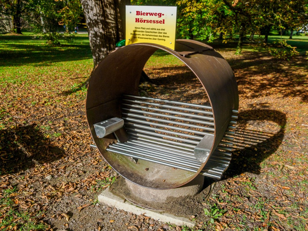 Further along, again as a part of the “Beer Weg” there is a metal seat which has a detailed commentary on the finer points of brewing, available at the touch of a button, for anyone who sits there. Sadly, we don’t speak any German.