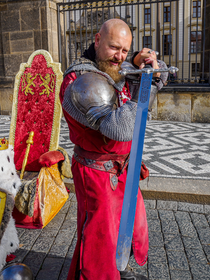 Outside, beyond the palace and castle, on a terrace, a man was clad in armour, wielding a sword for the entertainment of visitors.