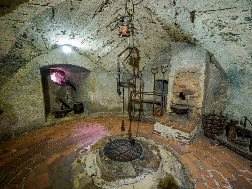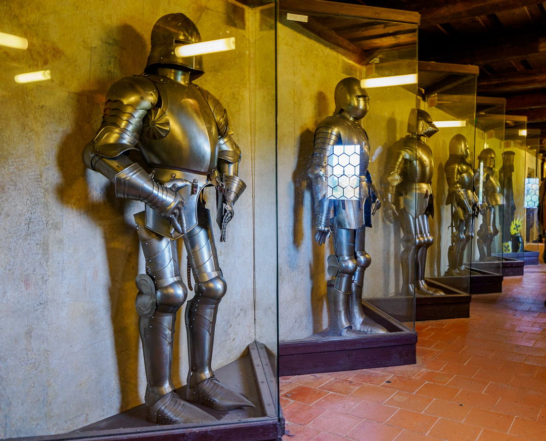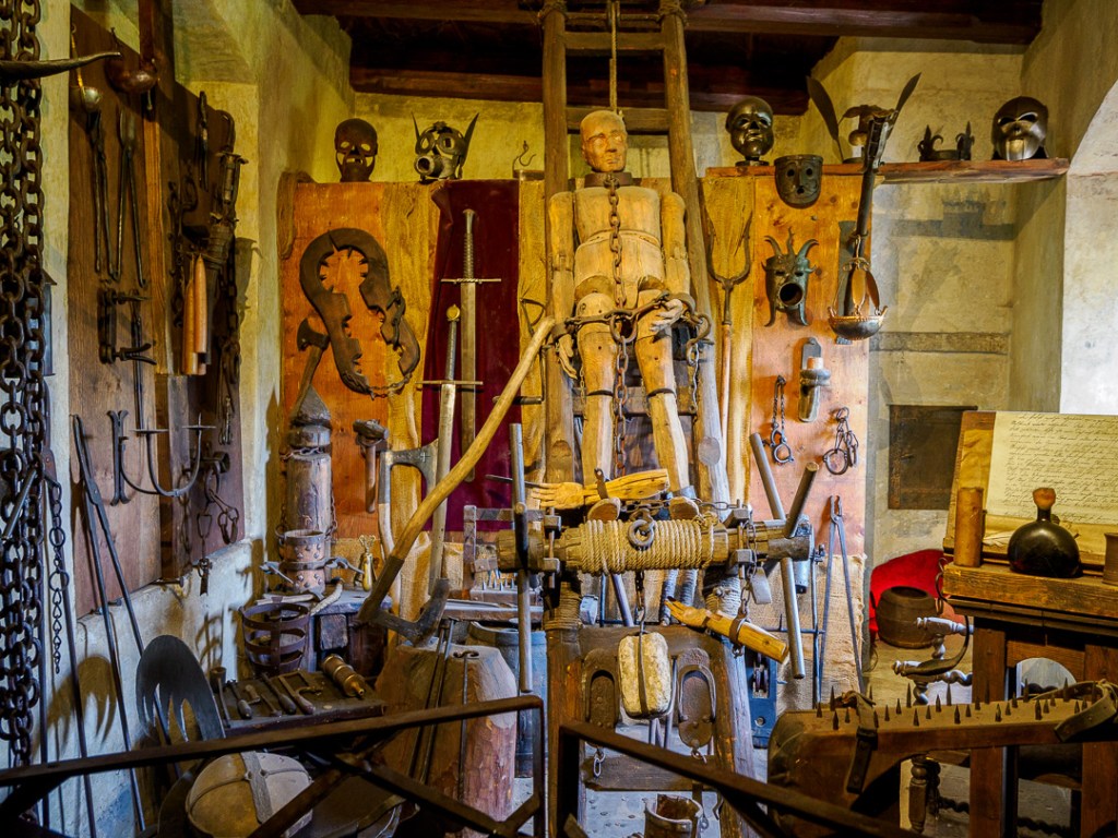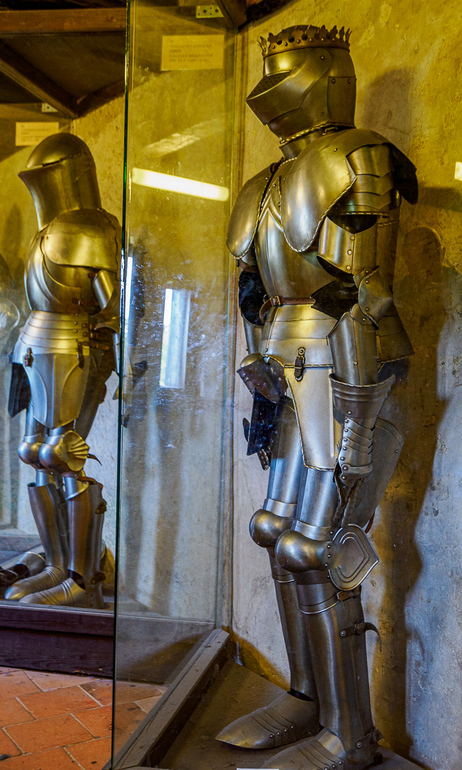 Above the houses, is a gallery museum with various suits of armour and torture implements: