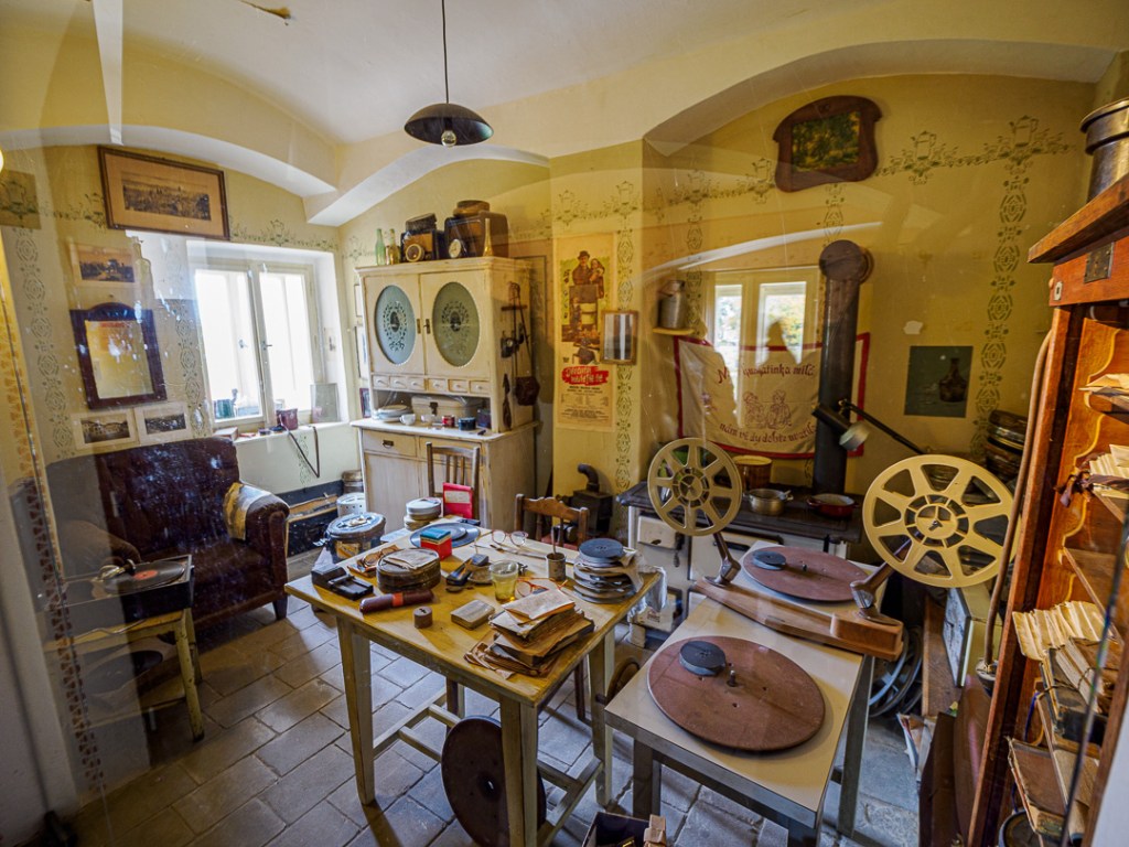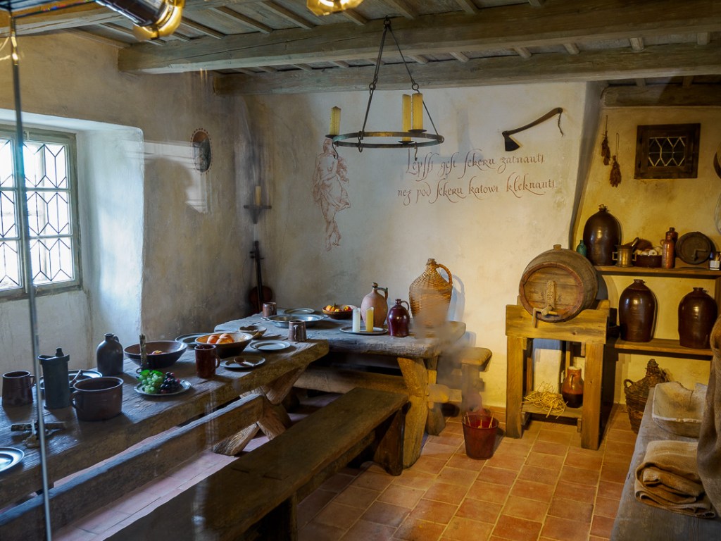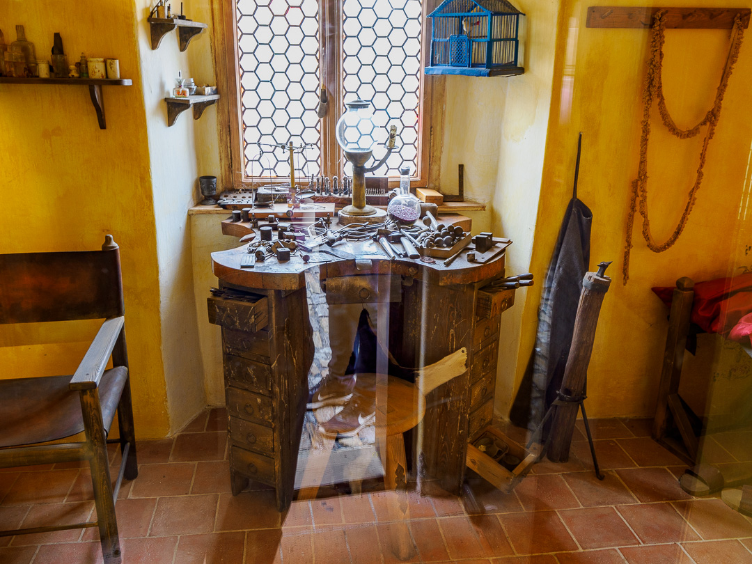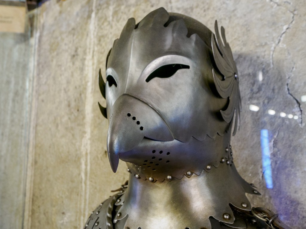Above the houses, is a gallery museum with various suits of armour and torture implements: