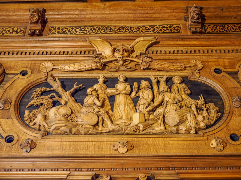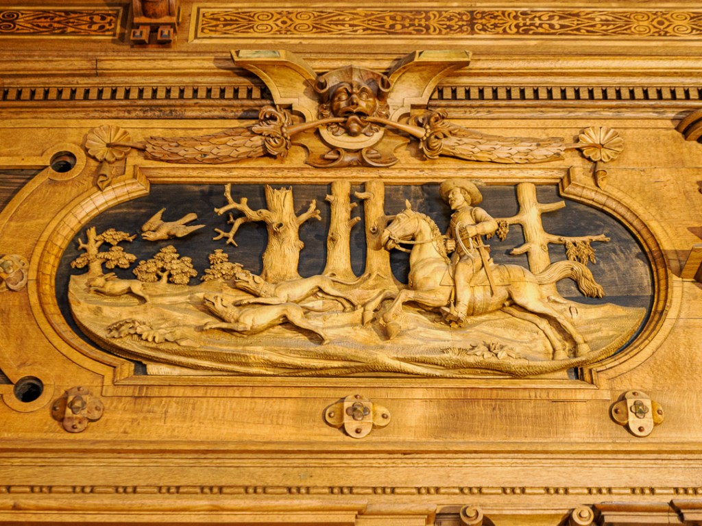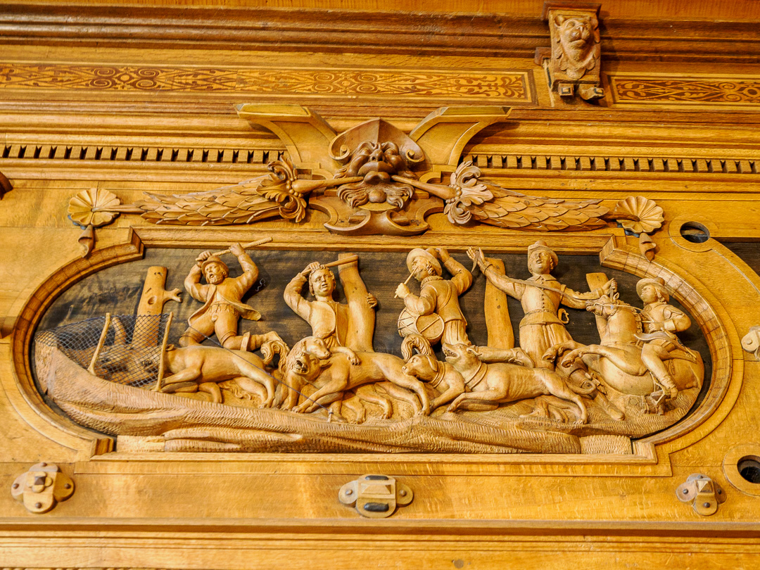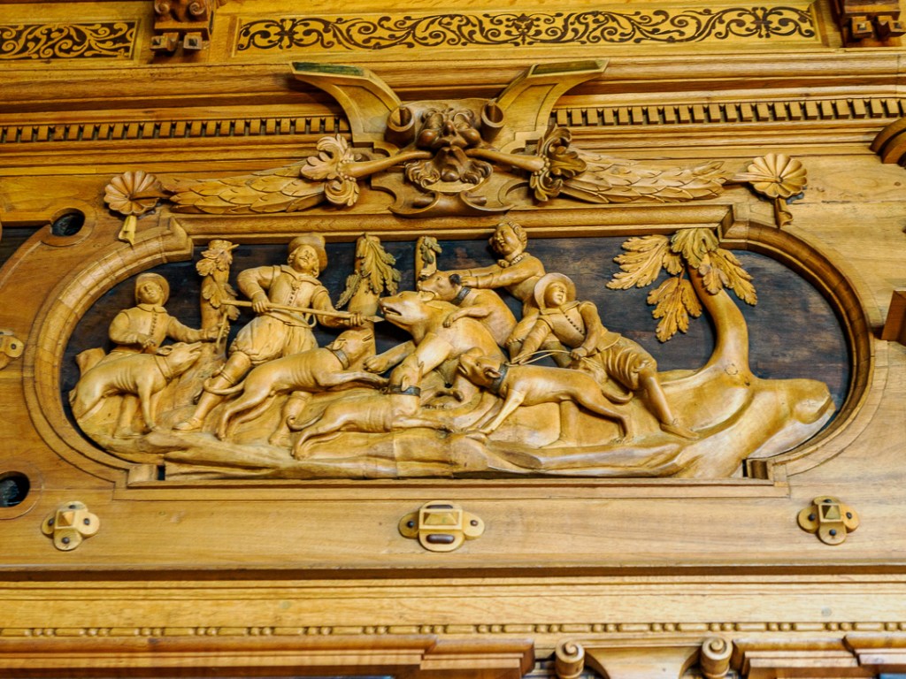 One room in particular, has the wow factor. The wooden carved panelling depicts many 3D scenes which all revolve around the theme of hunting: