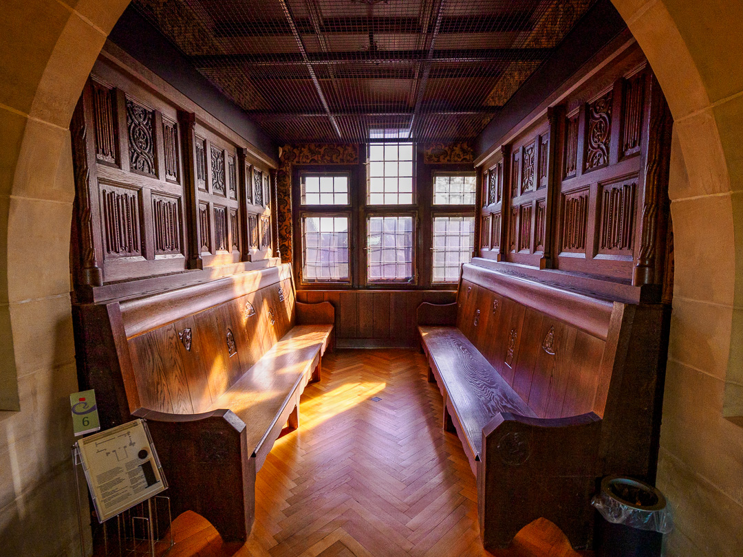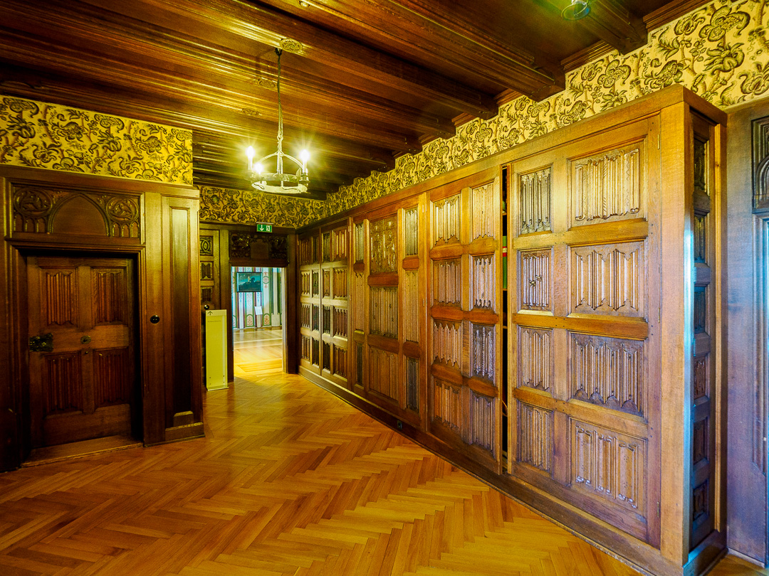 Many of the rooms are highly decorated with wood panelling, others have built-in furniture.
