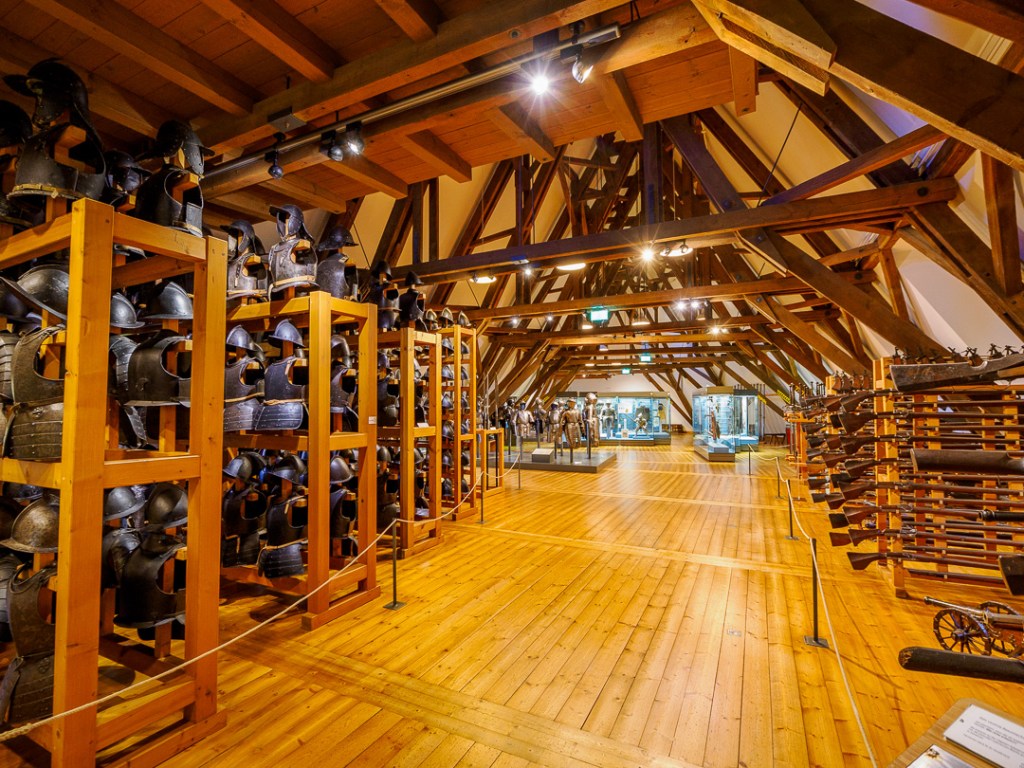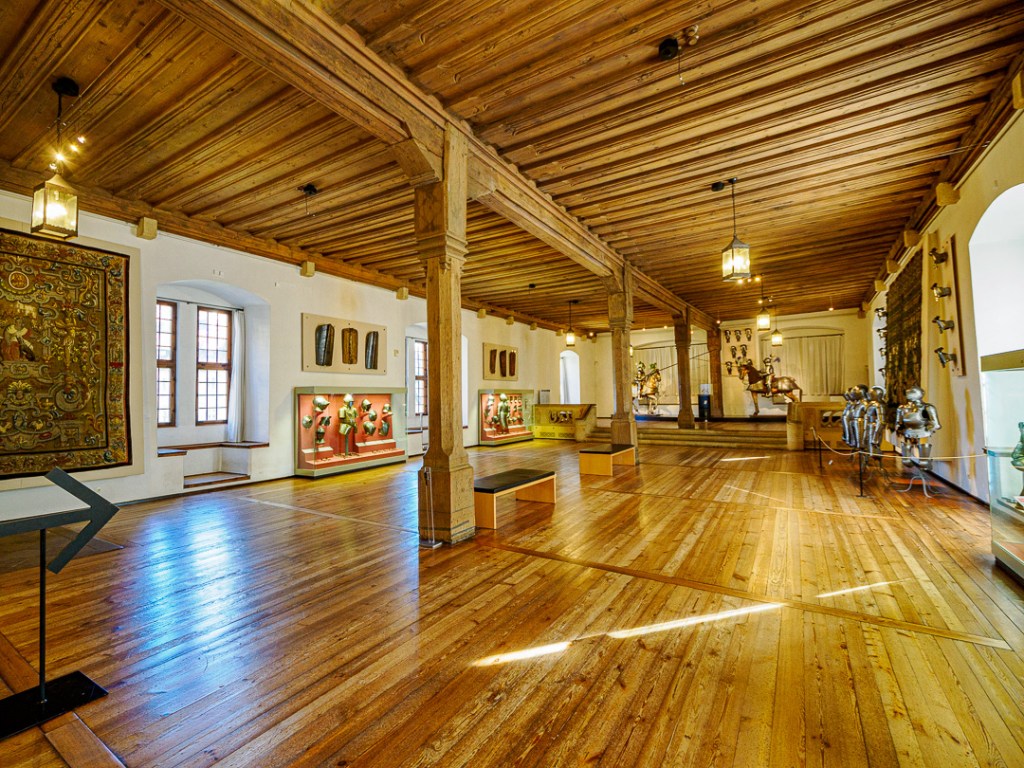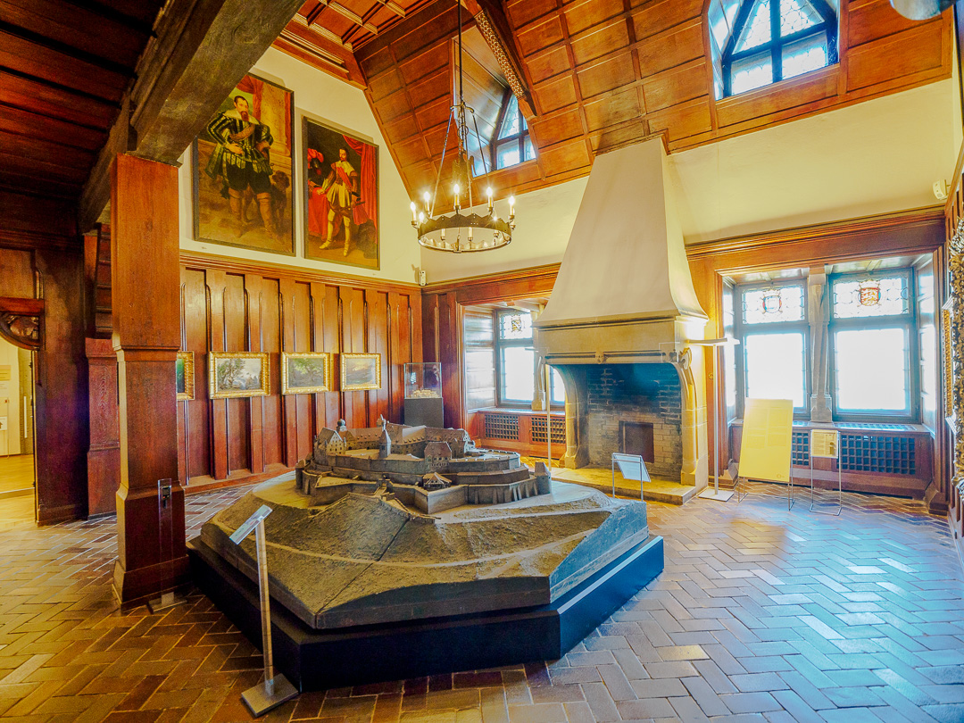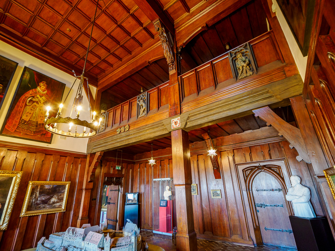 The wood-panelled room below has a mezzanine gallery and a large model of the castle: