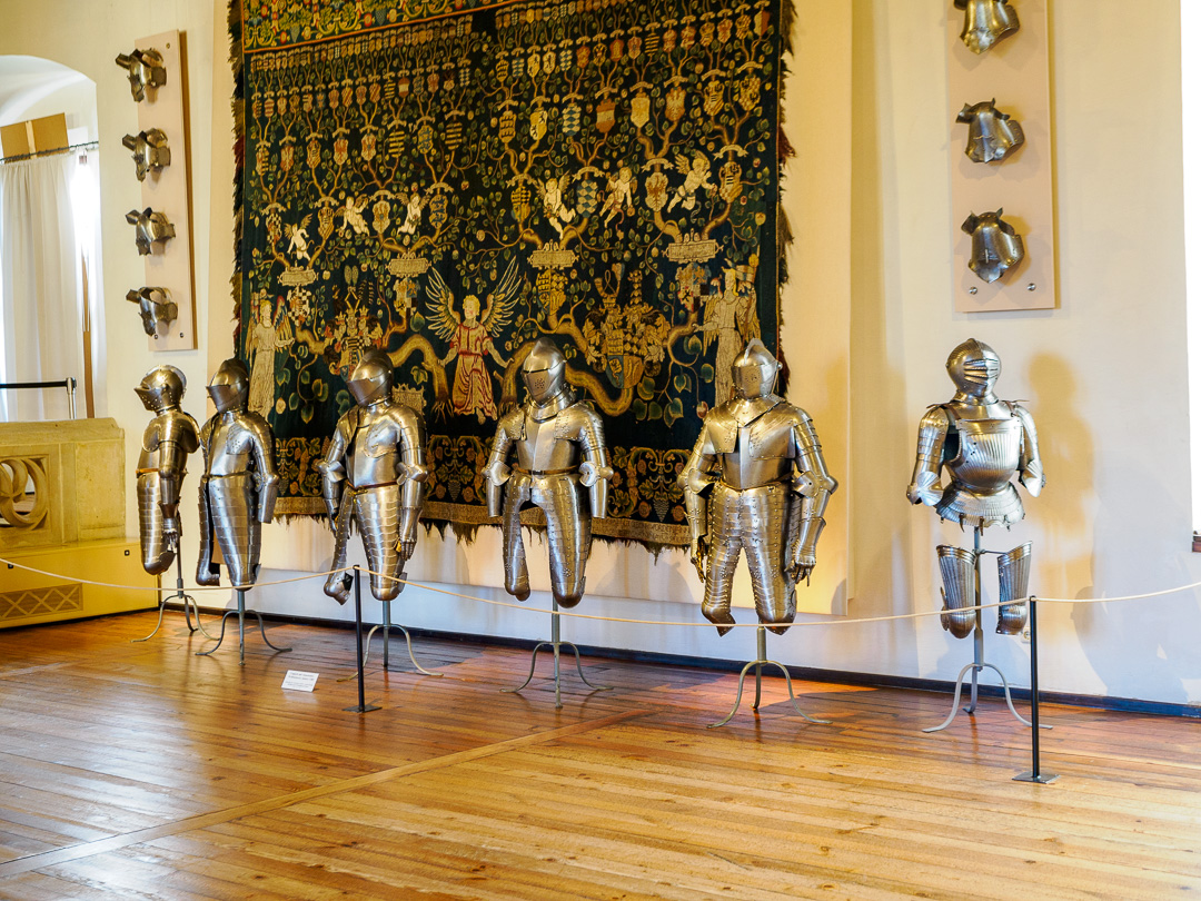The large ballroom had a couple of knights mounted on horses at one end and a display of knight’s armour: