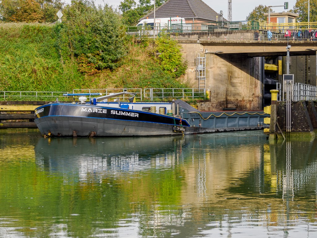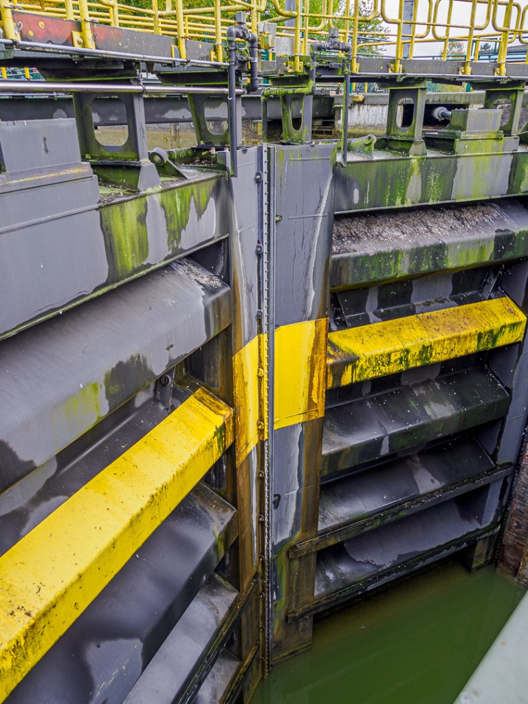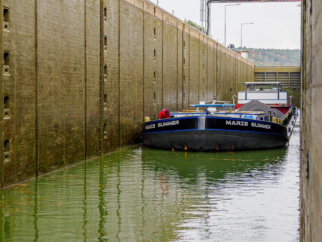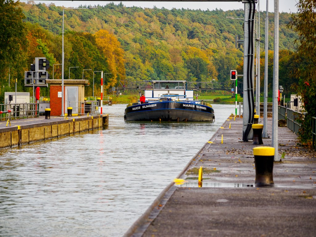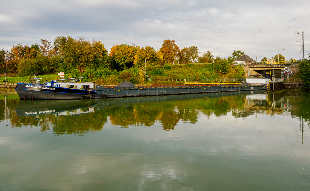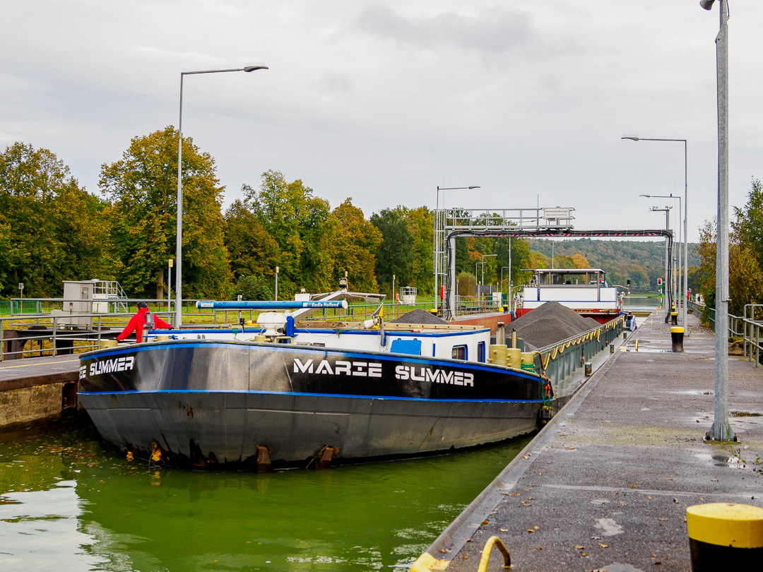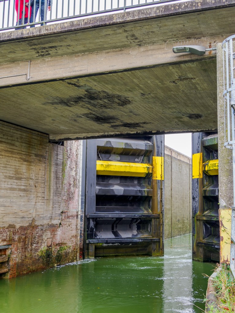 A couple of miles away, there is a lock. As the canal barges are huge, the lock is also huge to be able to accommodate them. We watched a barge descend through the lock: