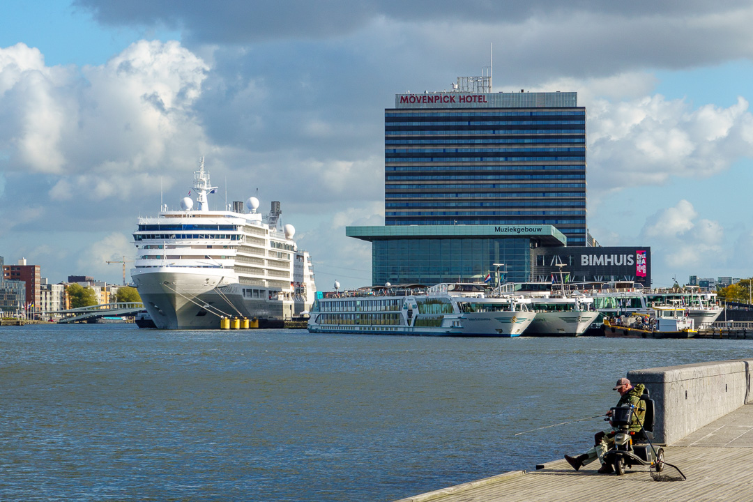 On the terrace behind Centraal Station, you can see passenger liners. One was docked, along with several river cruisers.