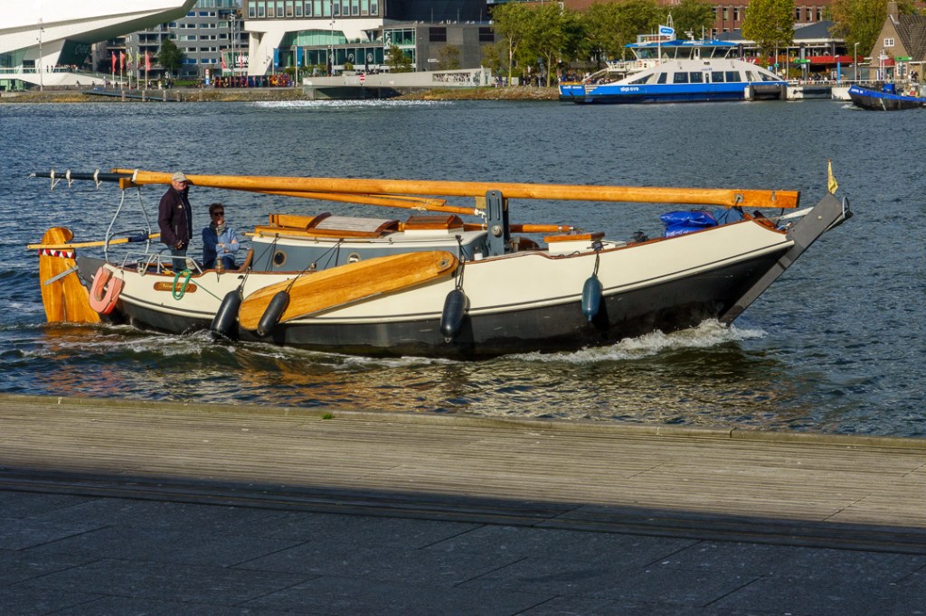 This is a busy stretch of water with many ferries, but what took my eye, was this sailing boat with its mast down and its keel strapped to the side: