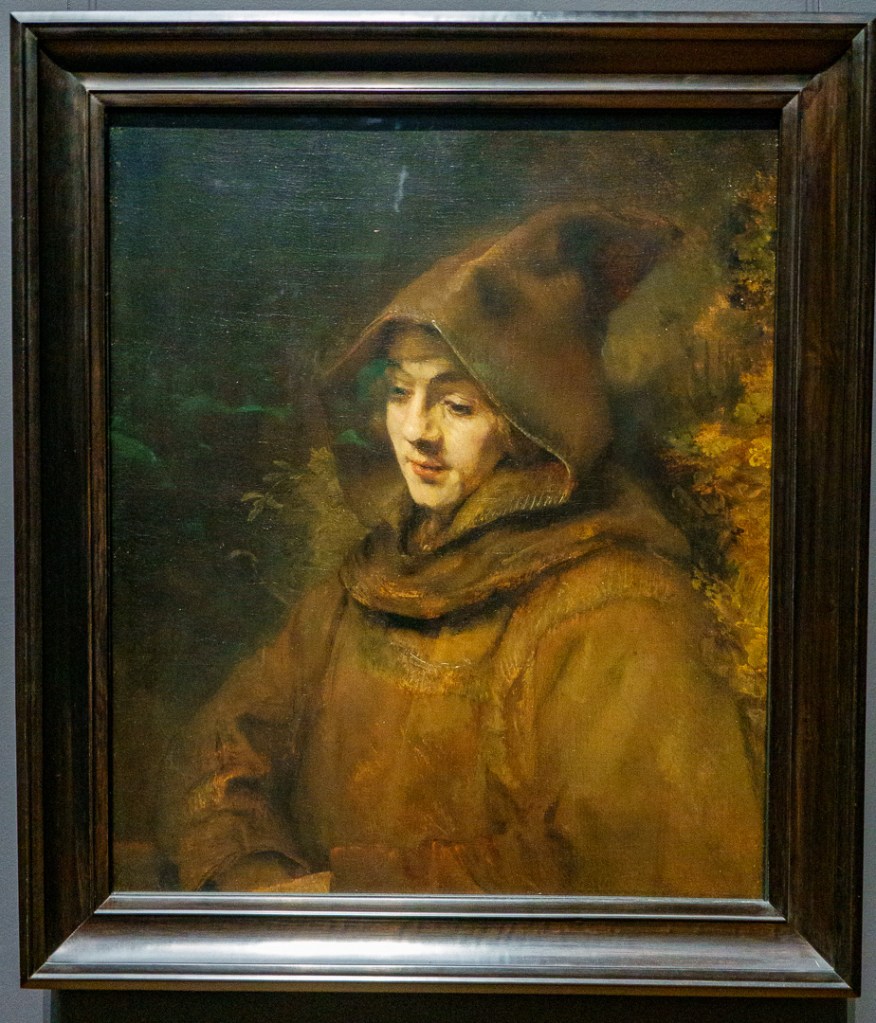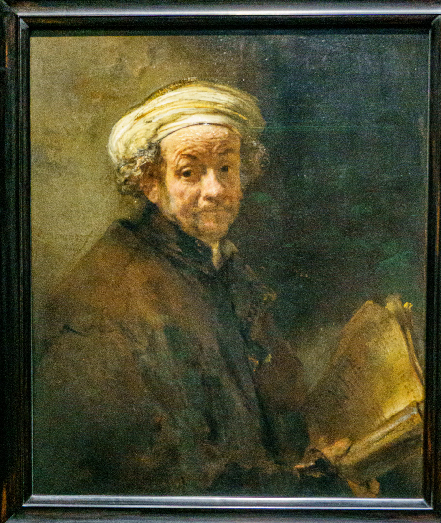 A woman explained that it could take many years to fully restore the work. They clean the surface, then remove the old varnish as far as possible, then apply a modern clear varnish which does not age, to protect it. They will then re-apply a coat of the original type of varnish, which has a yellow tint, because when Rembrandt painted it, he would have taken into account the aging process in choosing his colours.